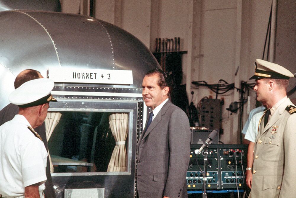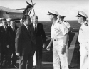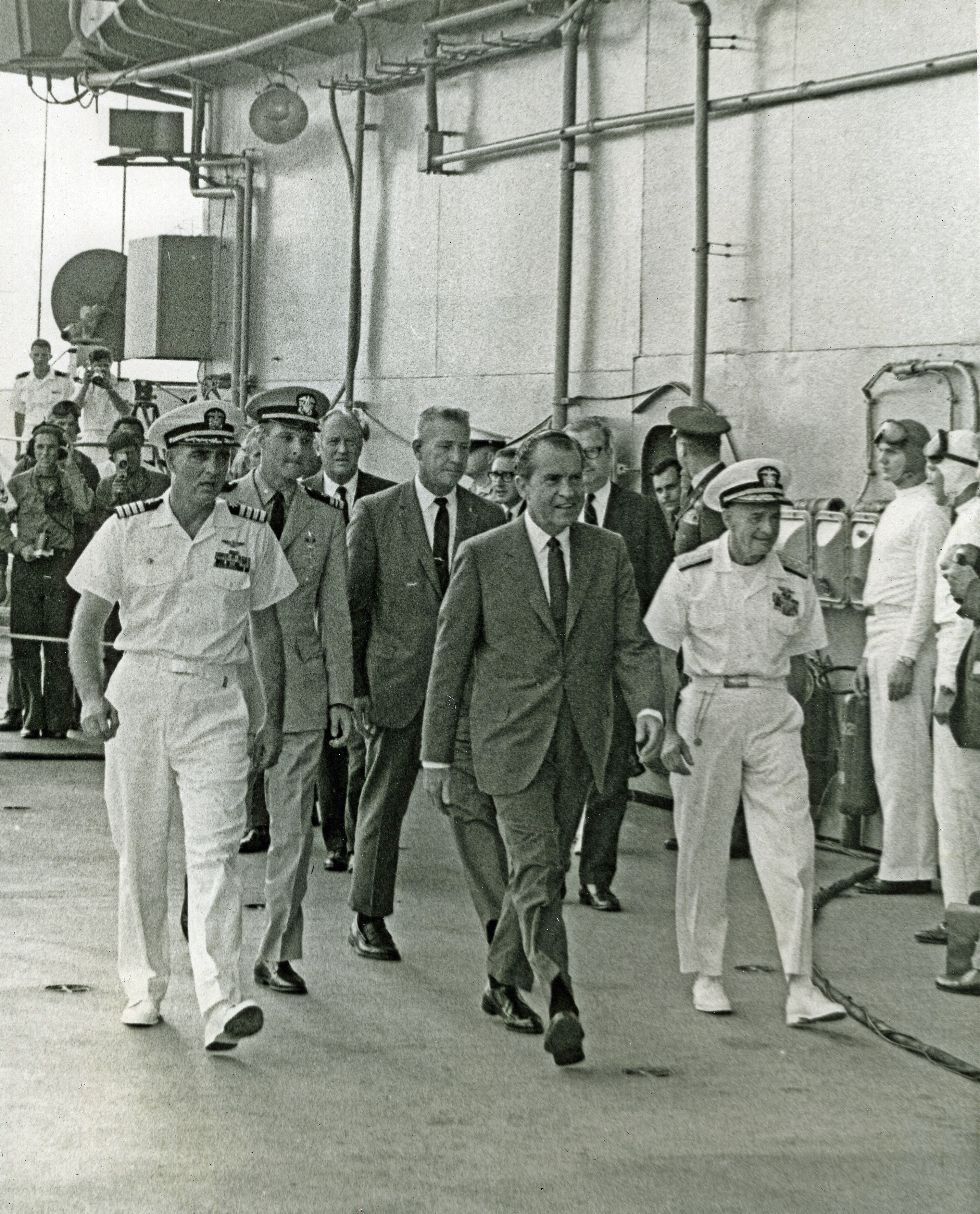 404k | President Richard Nixon arrived aboard USS Hornet (CVS-12) at 0512 on 24 July 1969. He and his party were honored with a traditional "side boy" salute before being greeted by Commander In Chief, Pacific (CINCPAC) Admiral John S. McCain, Jr., and Hornet Commanding Officer CAPT Carl J. Seiberlich. National Aeronautics and Space Administration (NASA) photo, # 6900597. |