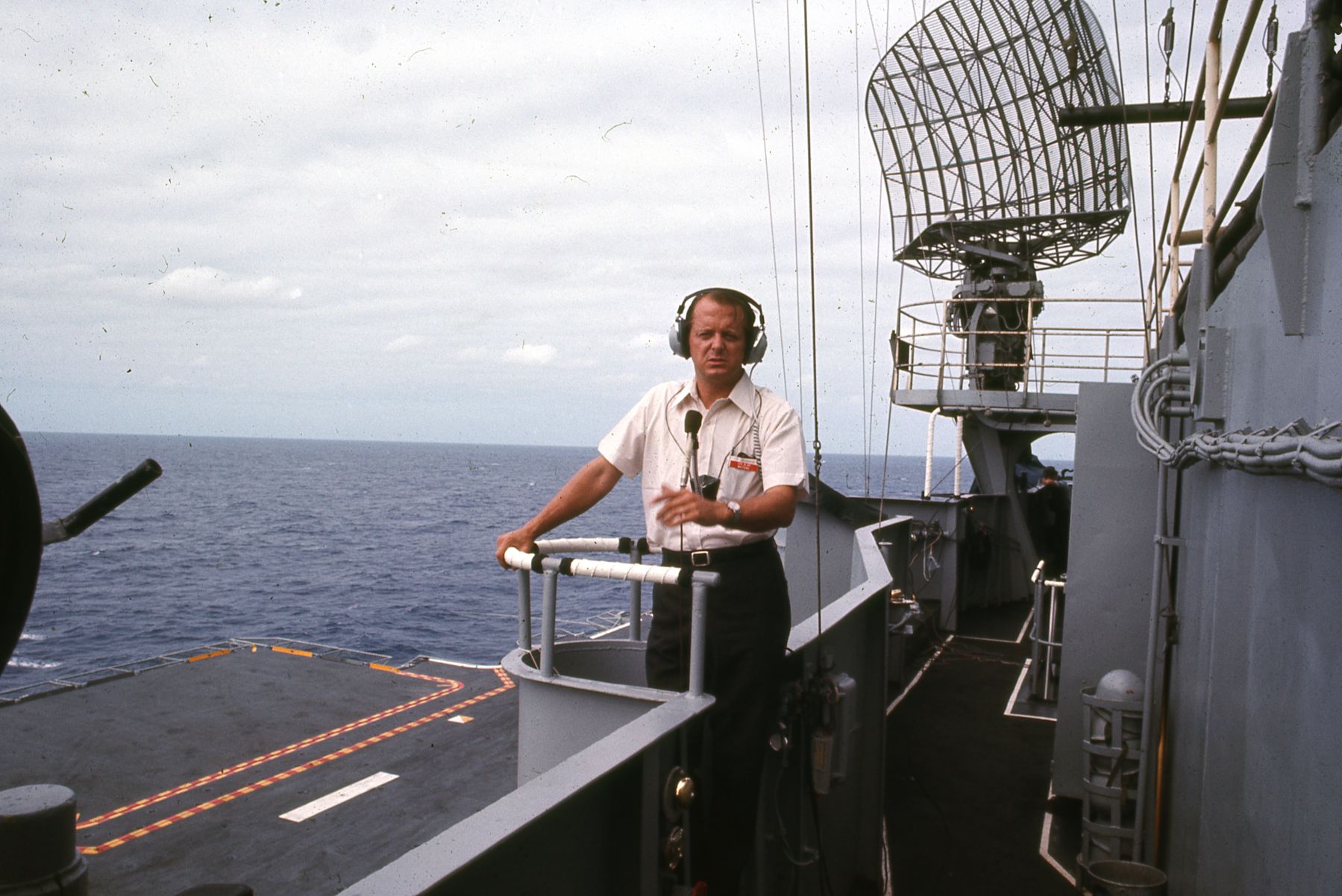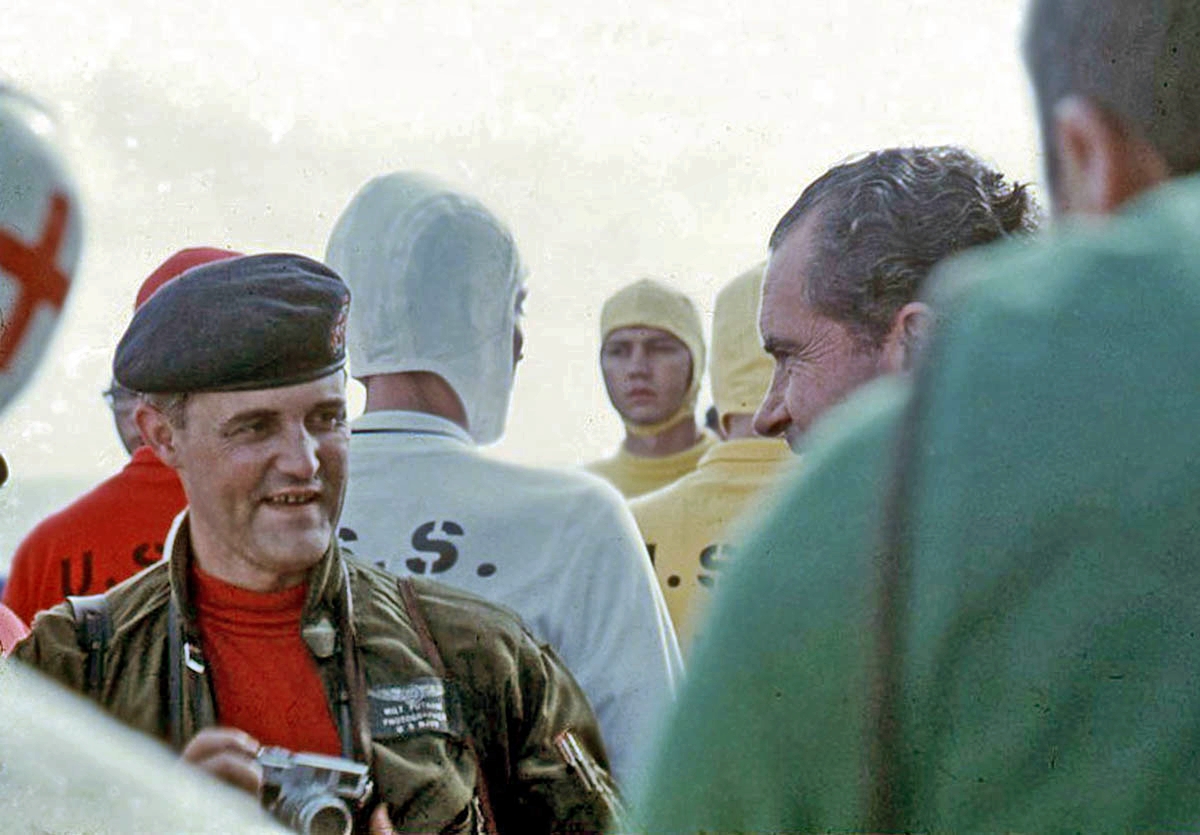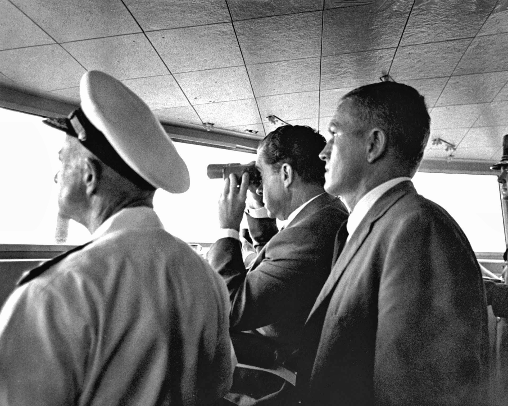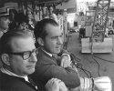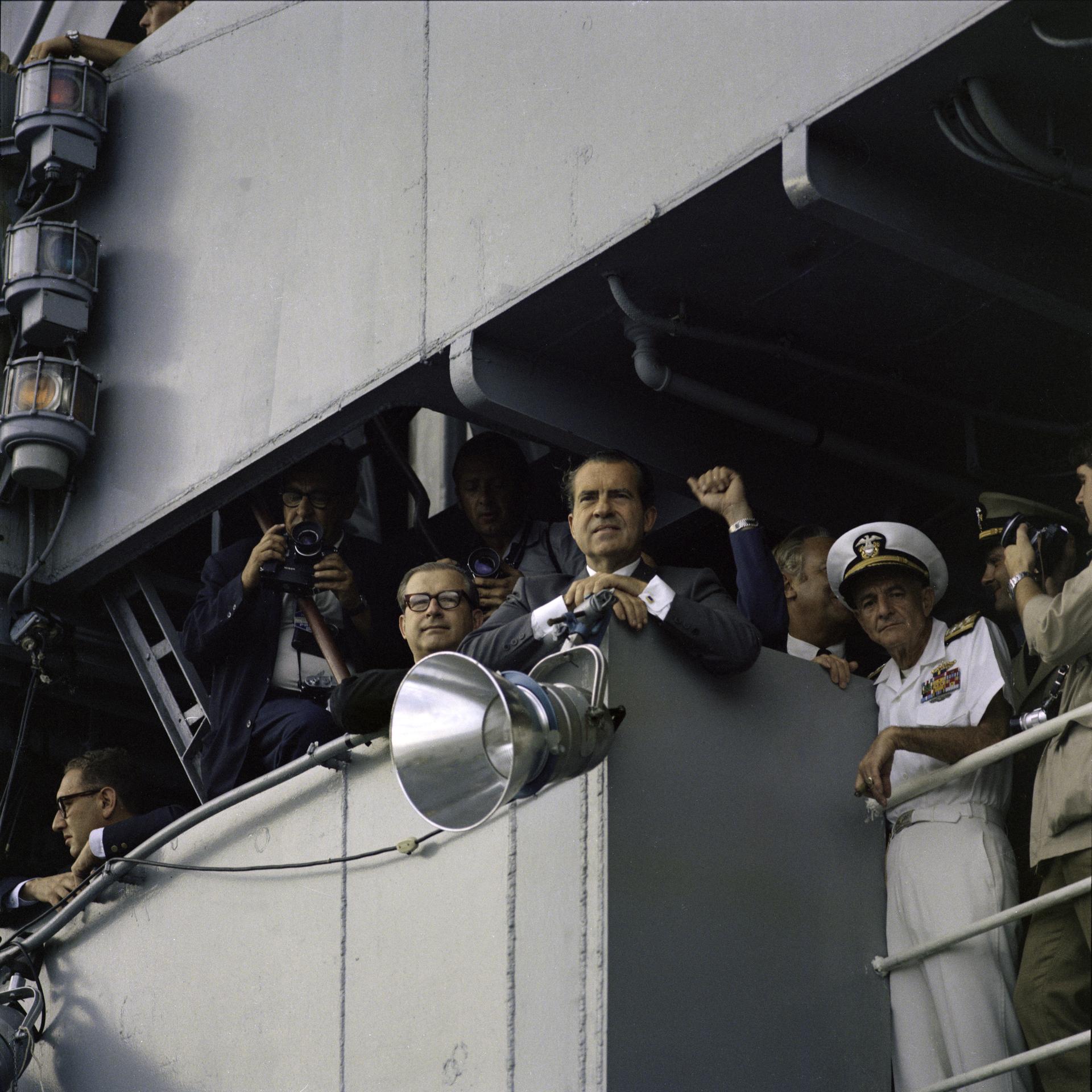376k | President Nixon spent 15 minutes on the Flag Bridge, candidly chatting with members of the media and various ship's crewmen, thoroughly enjoying the moment. At 0544, the sonic boom of the spacecraft dropping below the sound barrier alerted the ship to its impending arrival. The president watched the following astronaut recovery activities from this spot. History buffs should be able to identify Harry R. Haldeman, Assistant to the President and (White House) Chief of Staff; Henry A. Kissinger, Assistant to the President for National Security Affairs; Richard M. Nixon, President of the United States; Admiral John S. McCain, Jr., Commander-in-Chief, US Pacific Command; and Ron Ziegler, White House Press Secretary. US Navy photo. |