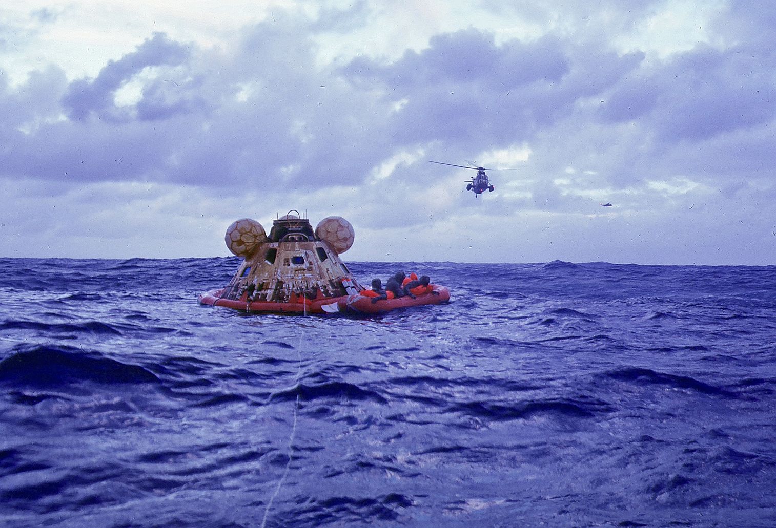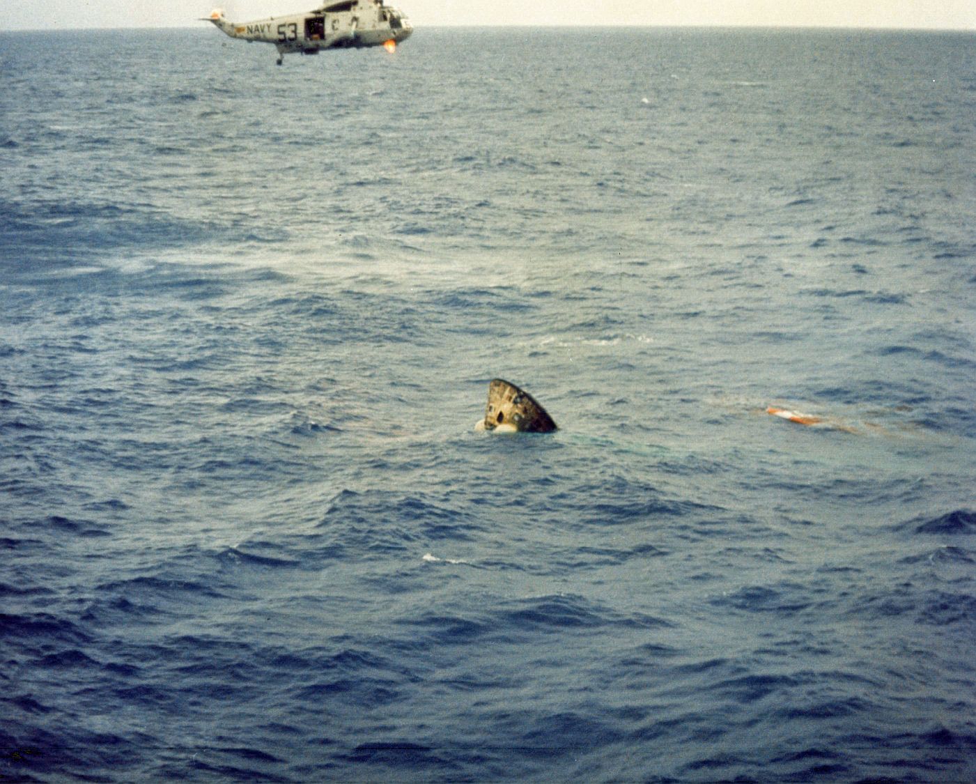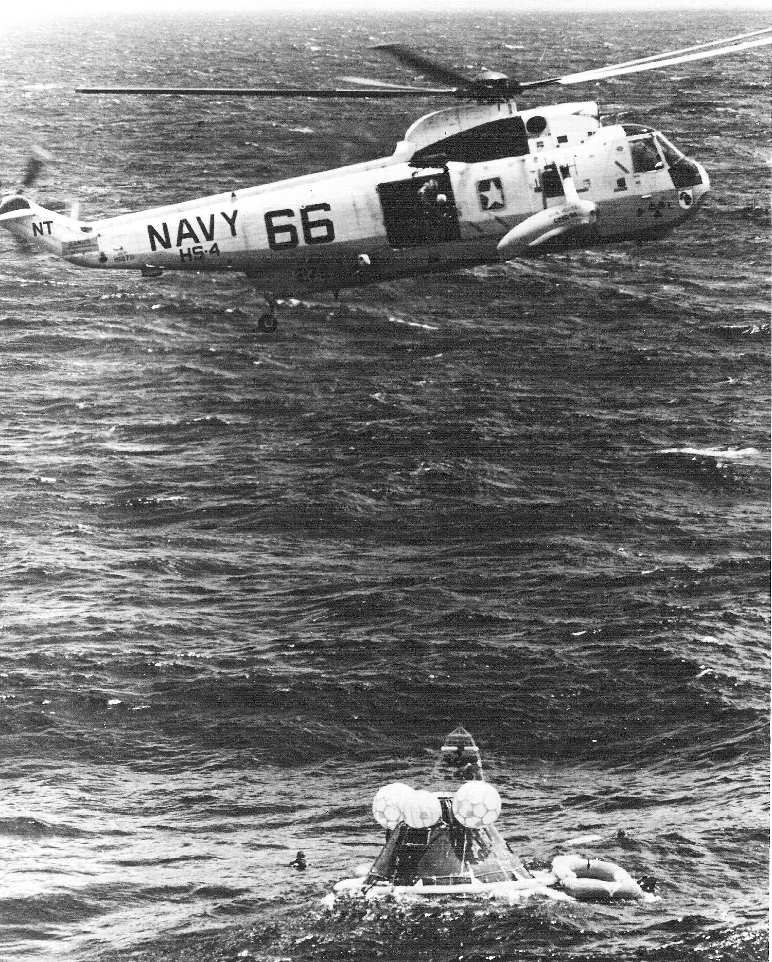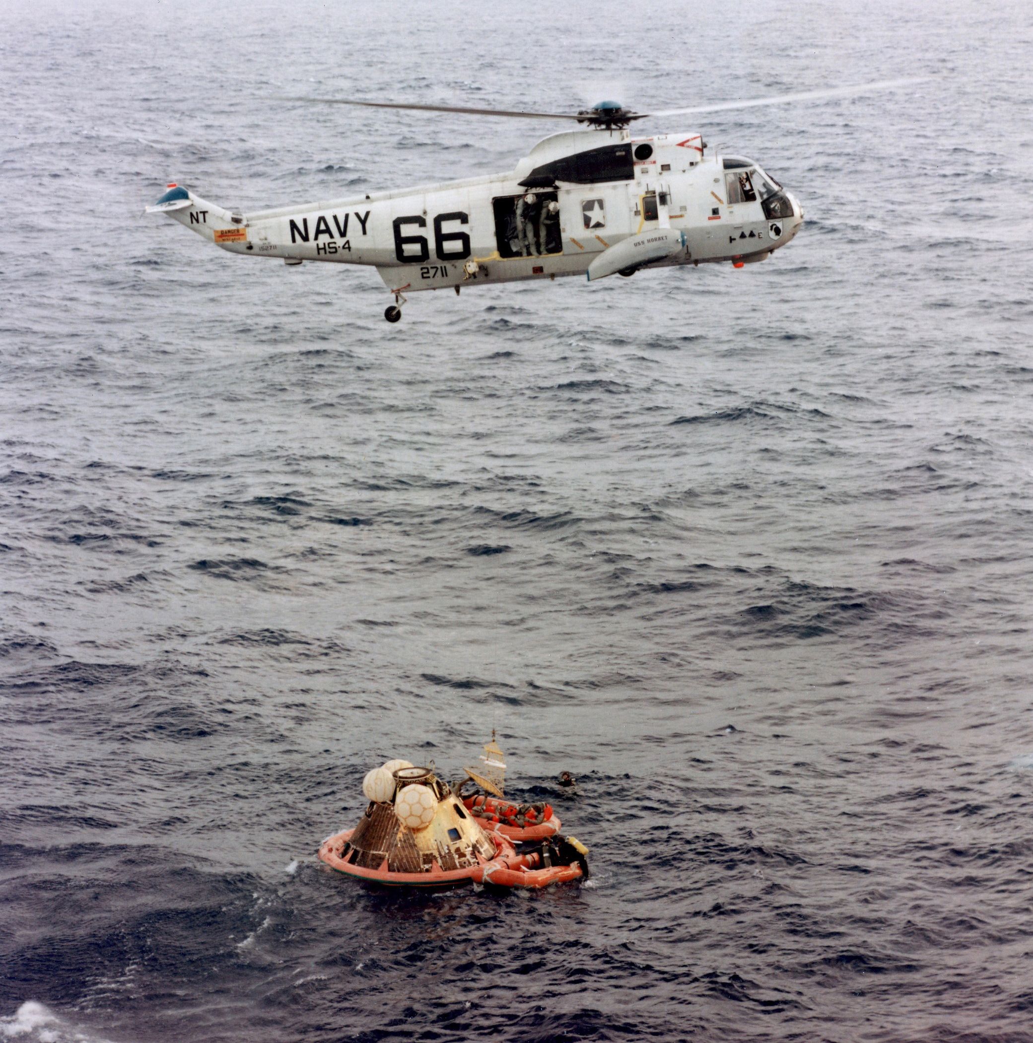 592k | The prime recovery ship for Apollo 12, USS Hornet (CVS-12), maneuvers to recover the Command Module (CM), Yankee Clipper. An SH-3D Sea King helicopter from Helicopter Anti-Submarine Warfare Squadron Four (HS-4) (BuNo 154108, modex NT310), hovers over the CM to support the UDT-13 swimmers on the flotation collar. National Aeronautics and Space Administration (NASA) photo S69-22897. |