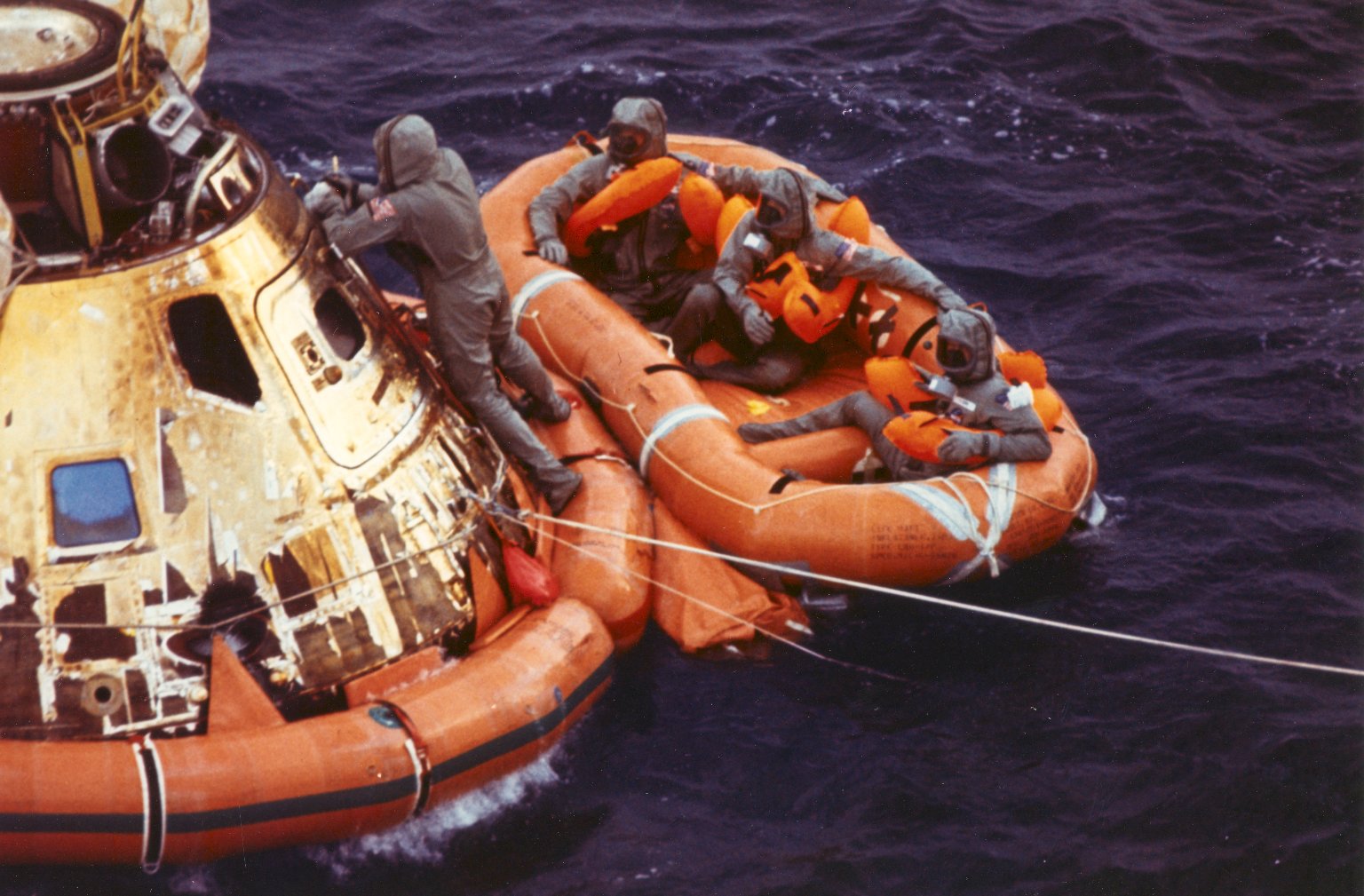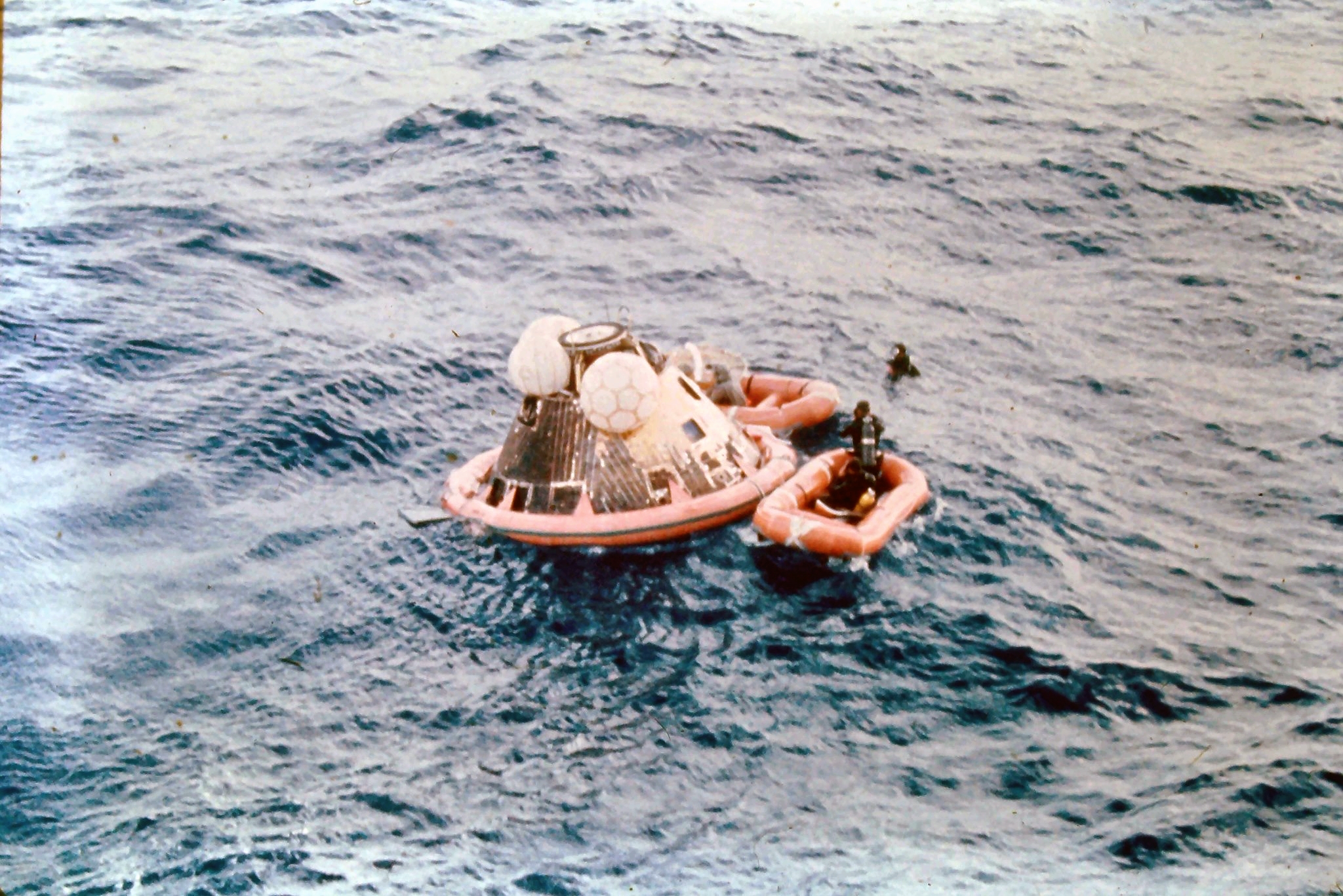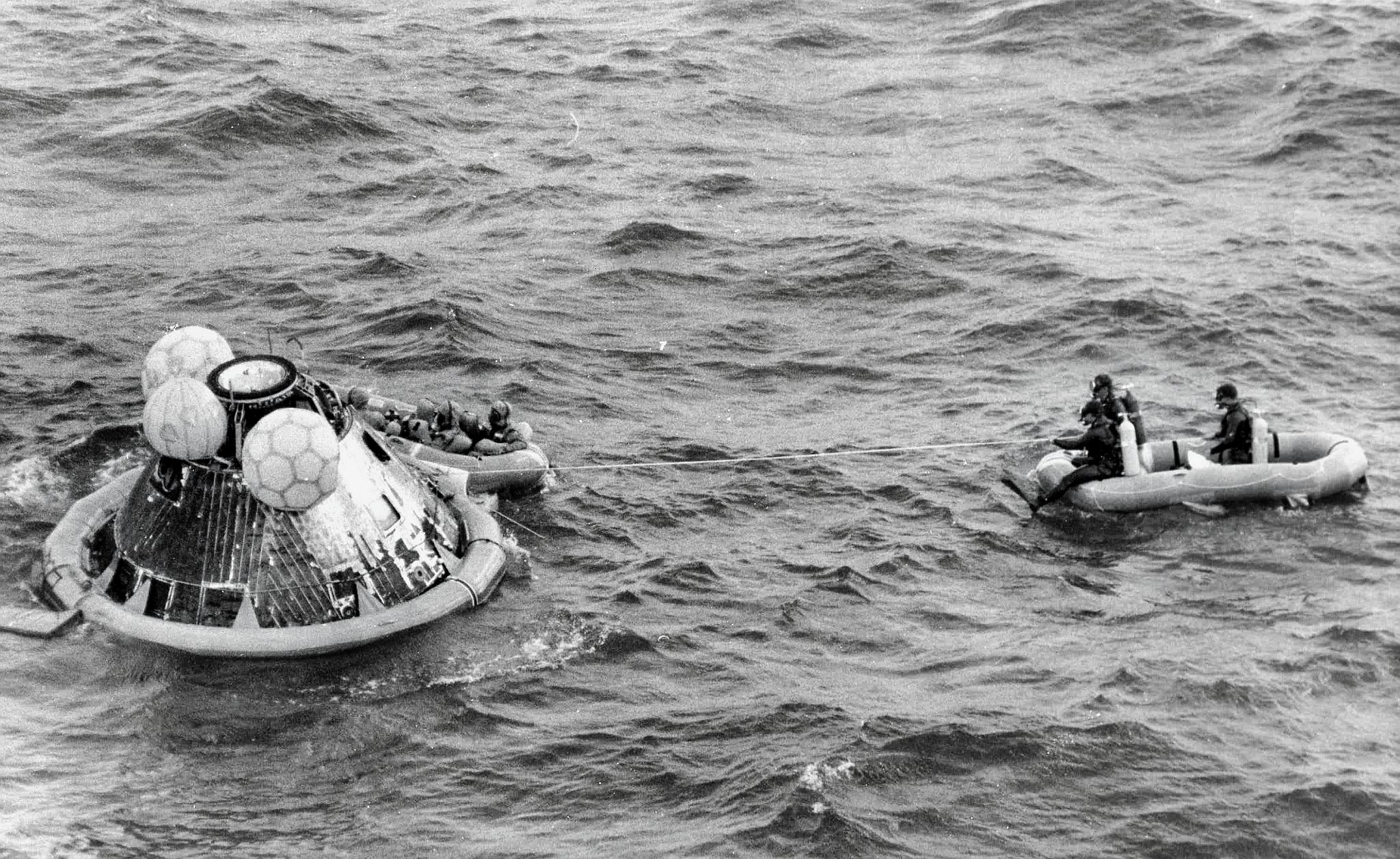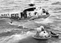 891k | During practice recovery, July 1969, Navy UDT swimmers (wearing orange and standing on flotation collar) finish attaching the flotation collar around the NASA boilerplate (a dummy capsule), with USS Hornet in background. US Navy photo by PH2 Milt Putnam, HS-4. |