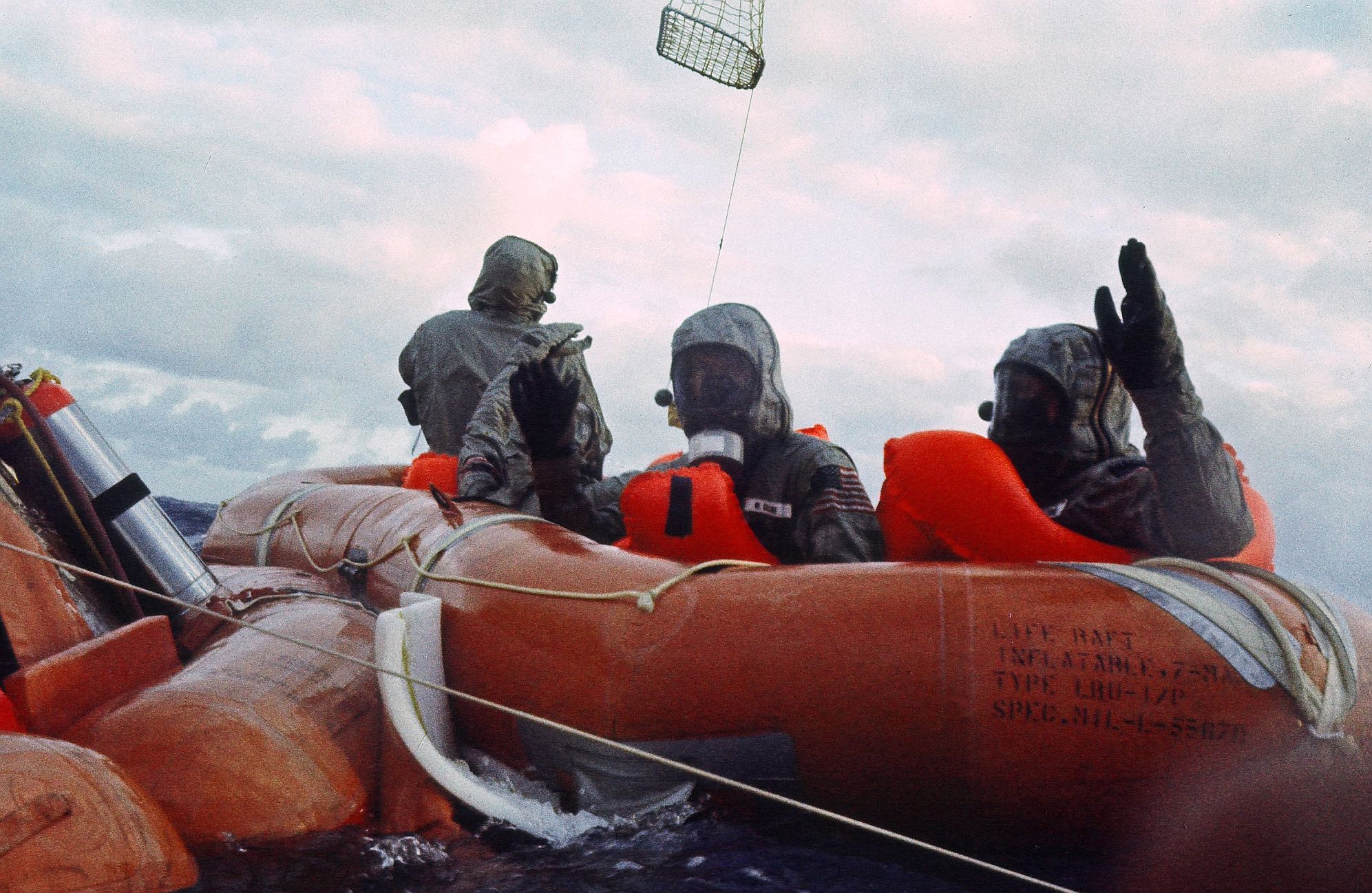 1.06M | An astronaut is now in the Billy Pugh rescue net and is being hoisted into the recovery helicopter, the world-famous "Helicopter 66." In comparison to photo NS-ha-570, note that the "66" is now shown in smaller digits and the Air Group designation (CVSG-59) has been added to the starboard sponson. At this point, only three CM decals, corresponding to Apollo 8, 10, and 11, can be seen under the cockpit. |