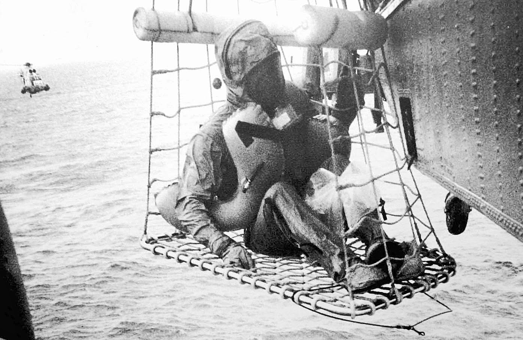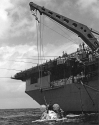 514k | Swimmers from UDT-13, standing on the Apollo 12 CM flotation collar, look up at the flight deck of USS Hornet (CVS-12) as they prepare for an in-haul line to be thrown to them. Observers on the forward catwalk are reporting the distance, drift rate and direction of the CM to Captain Carl Seiberlich to assist ship maneuvering. Hornet displaced 41,200 tons of water (full load) while the Yankee Clipper weighed just 6 tons, a huge disparity in the open ocean. |