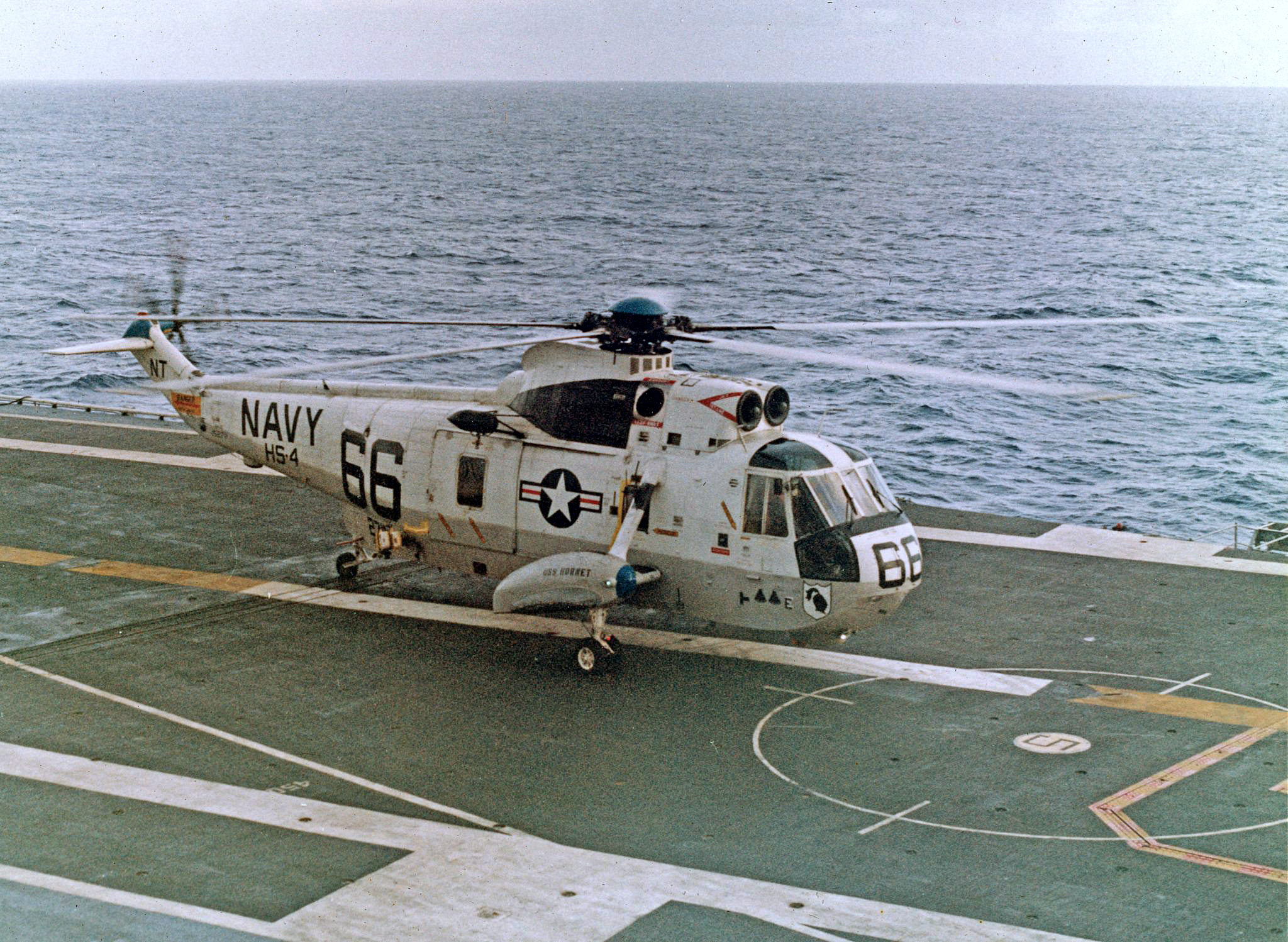 800k | A nice view of the starboard side of HS-4 "Black Nights" Sea King #66 (BuNo 152711) in flight. This photo was taken just after the recovery of Apollo 12 on Monday, 24 November 1969. Keen eyes will notice special modifications associated with the Apollo spacecraft recovery, such as the high-speed 70mm film camera mounted just aft of the cargo hatch (and aiming down) and the NASA SARAH (Search And Rescue And Homing) radio direction finding (RDF) antenna high up on the starboard landing gear strut, that provided the helicopter with the ability to home in on the spacecraft's radio beacon. By this time HS-4 side numbers had been changed to the 300 range, but 152711 had its new number painted out and replaced with the well known "66" on both sides and on the top of the fuselage, just behind the main rotor. In comparison to photo NS-ha-060, note that the "66" was now smaller and the Air Group designation, CVSG-59, had been added below "USS HORNET" on each sponson. A fourth black Apollo spacecraft decal was applied on the side of the cockpit before recovery of Apollo 12, then covered up, and uncovered as the helicopter landed with the astronauts aboard. Eventually this helicopter and HS-4 crews recovered the astronauts from five Apollo lunar flights—8, 10, 11, 12 and 13. USN photo by PHCS Robert L. Lawson. |