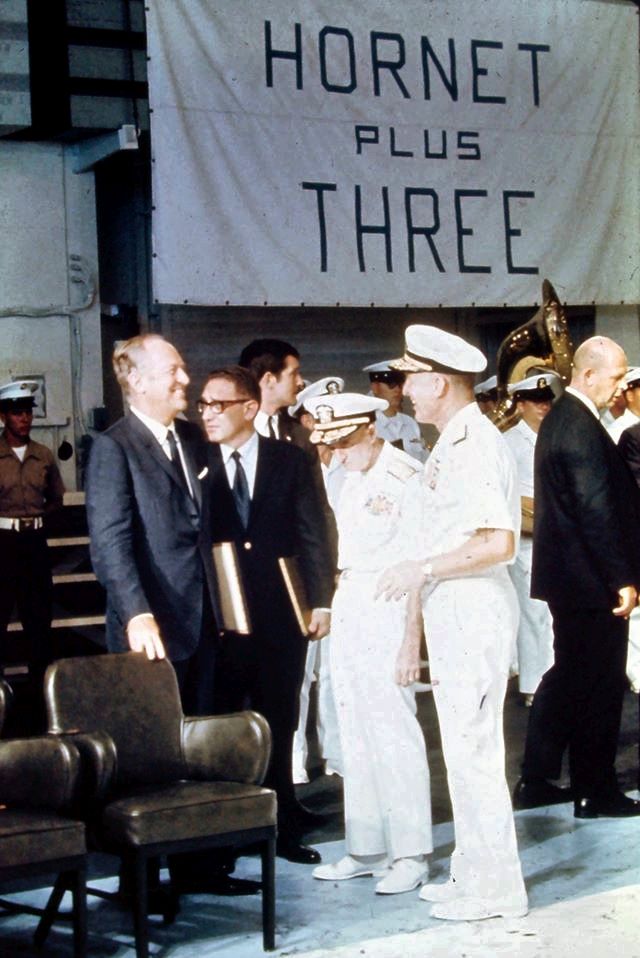 131k | The WWII Essex-class aircraft carrier USS Hornet (CVS-12) was selected as the Primary Recovery Ship (PRS) for the Apollo 11 mission. Because of the Vietnam War, major US Navy combatant vessels in the Pacific Fleet were being carefully scheduled. Hornet had just completed her third (and final) tour off the coast of Vietnam and was available for special assignment. |