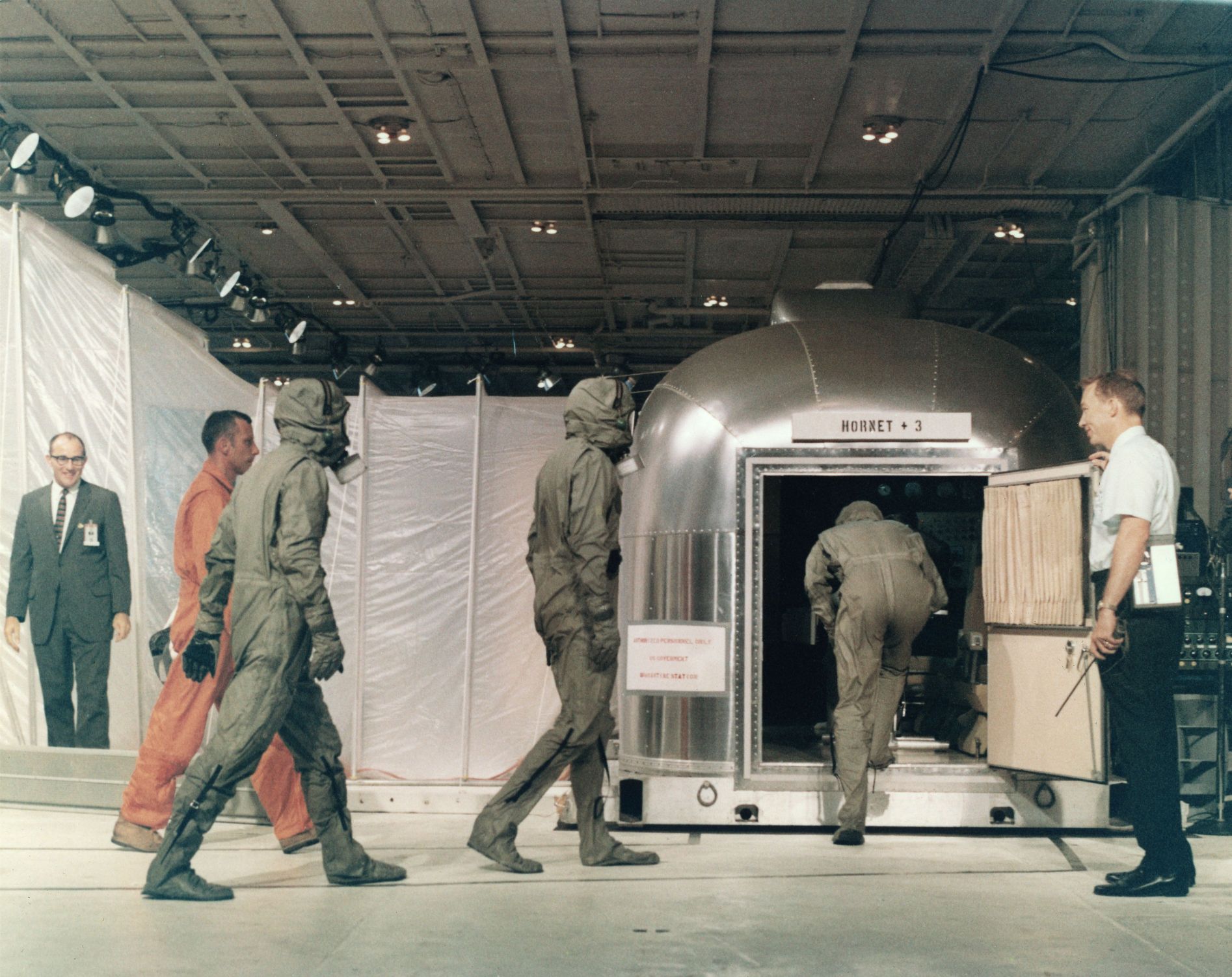 279k | Captain Carl J. Seiberlich, CO of USS Hornet (CVS-12), welcomes the Apollo 12 astronauts, in their Mobile Quarantine Facility on the hangar deck, aboard. Naval History & Heritage Command (NH&HC) photo USN 1142563. |