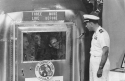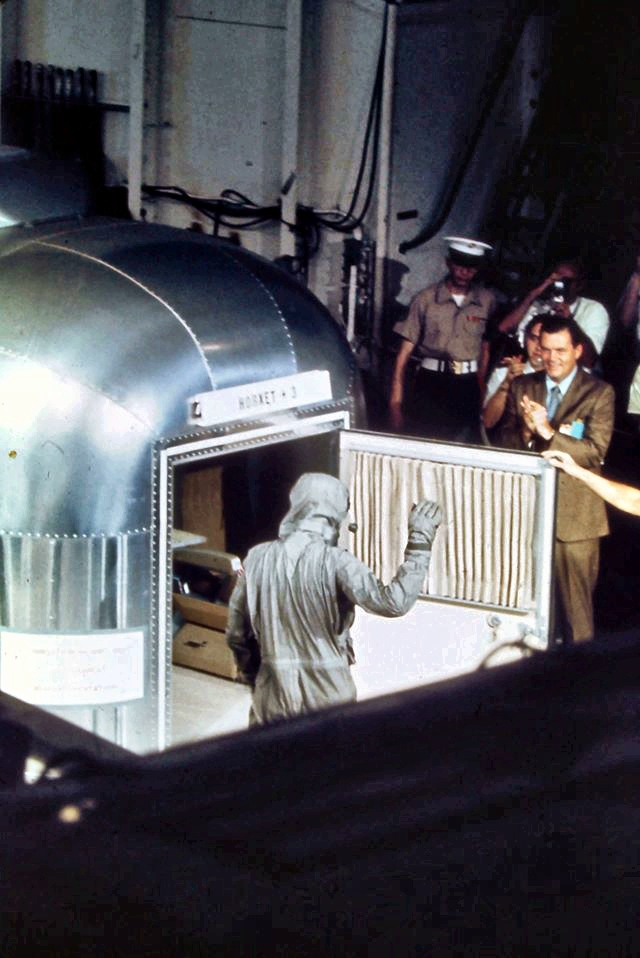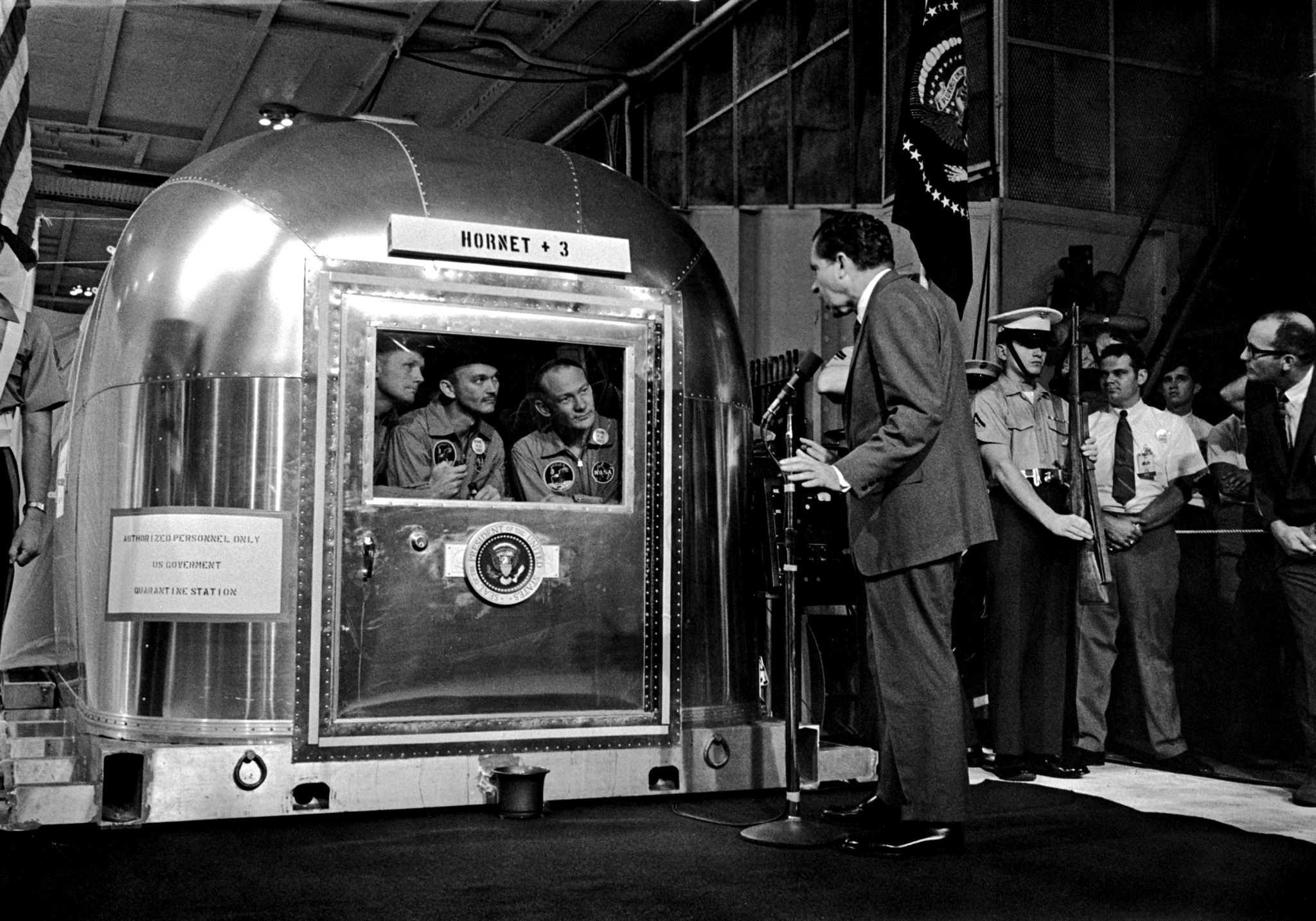 842k | President Richard M. Nixon and Dr. Thomas O. Paine, NASA Administrator, watch Apollo 11 astronauts Neil A. Armstrong, Michael Collins and Edwin "Buzz" Aldrin Jr., walk from the recovery helicopter to the Mobile Quarantine Facility aboard USS Hornet (CVS-12). The President later congratulated the astronauts by microphone, speaking through a window of the quarantine trailer. National Aeronautics and Space Administration (NASA) photo, # 108-KSC-69P-662. |