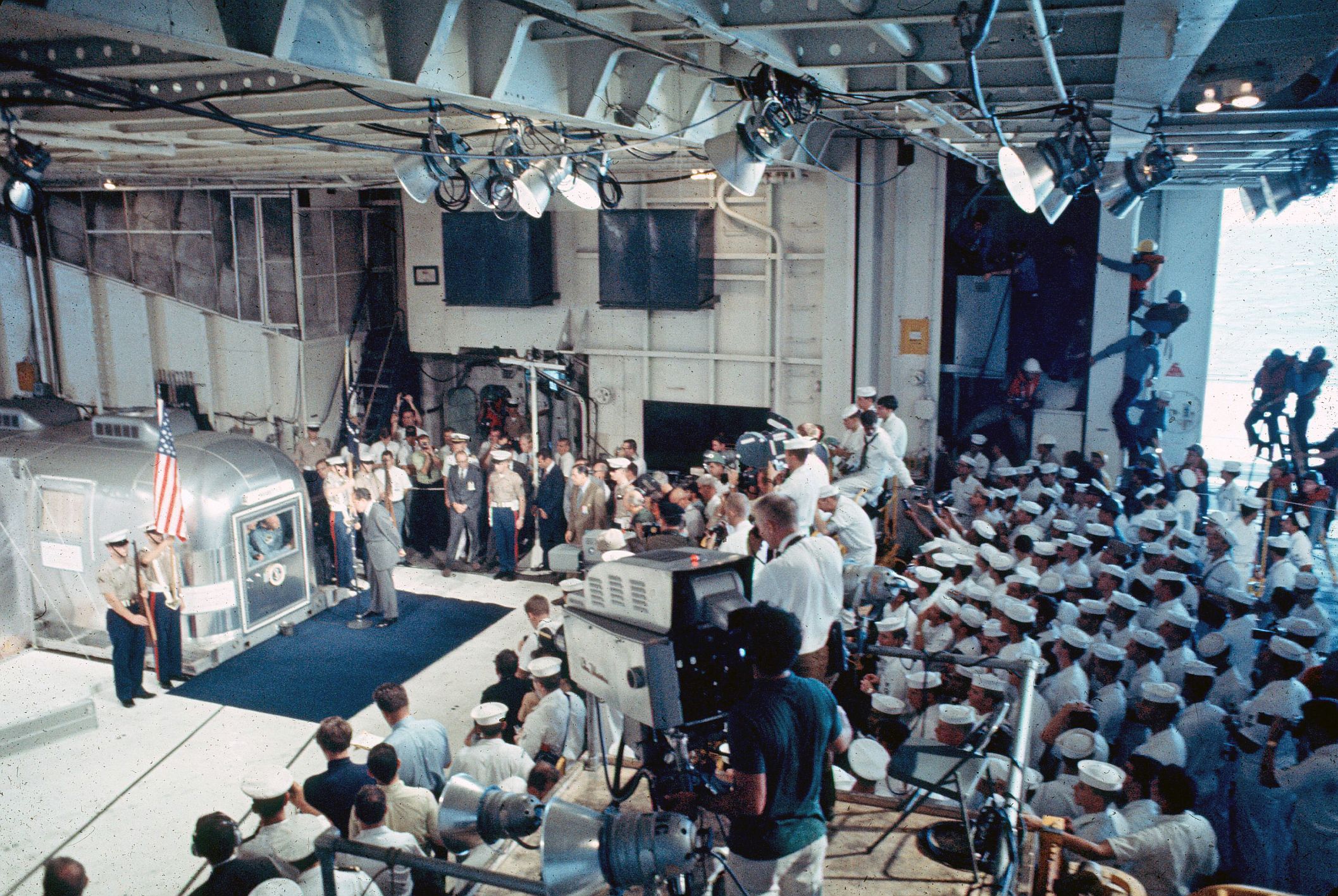 499k | From his perch above the Hornet flight deck, radio commentator Don Blair captured this moment after the MQF had been backed up to a stage next to Pier Bravo. The astronauts were welcomed to Hawaii by several dignitaries and hundreds of citizens who were allowed onto the Pearl Harbor Naval Base. CINCPAC, ADM John S. McCain, was speaking at this moment. Photo by Don Blair. |