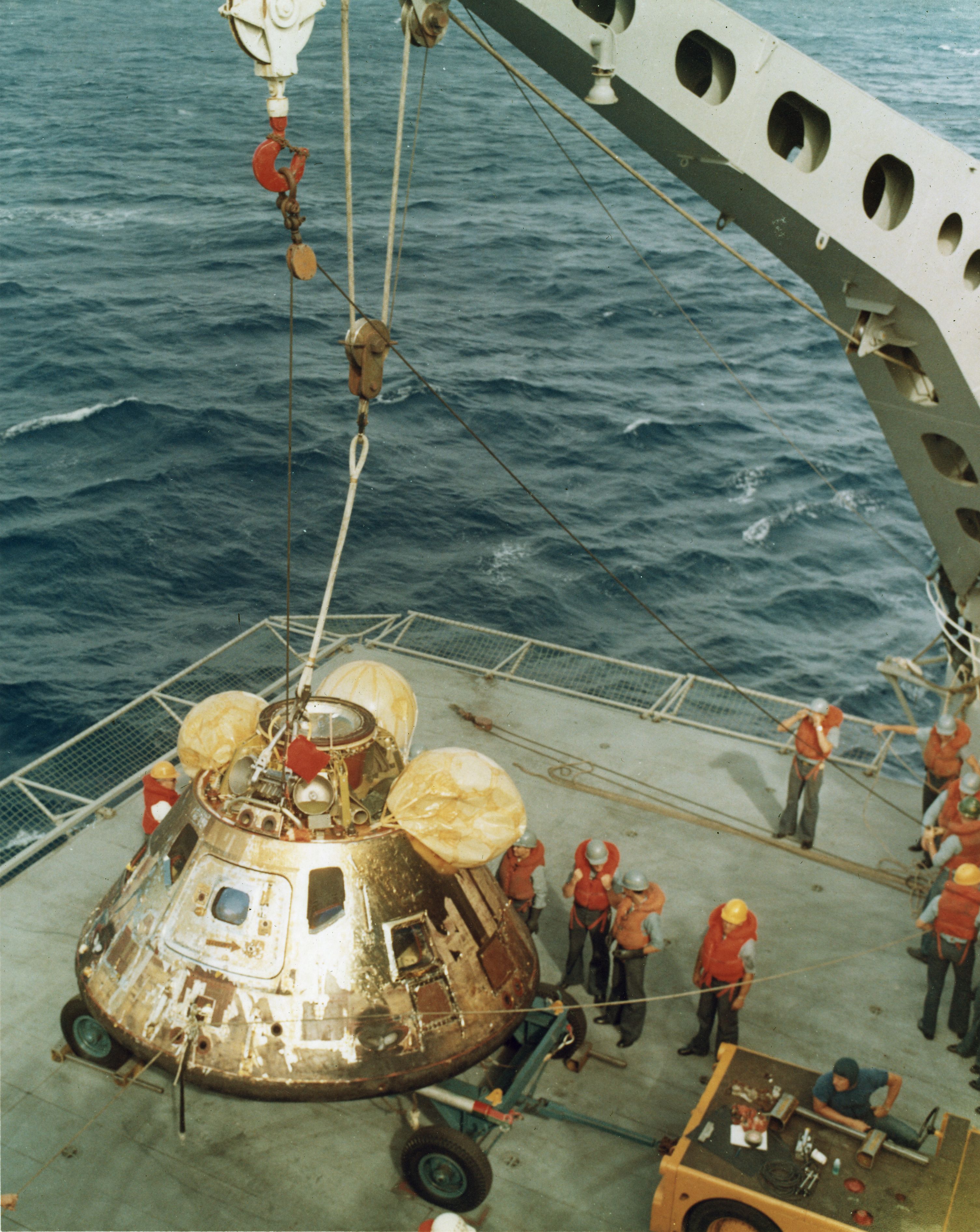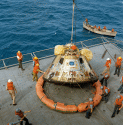 571k | USS Hornet (CVS-12) had a long and distinguished lineage in US history starting with World War II. Her immediate predecessor, USS Hornet (CV-8) had launched the famous Doolittle Tokyo Raid in WWII. As an aircraft carrier, she was a very stable platform with redundant propulsion systems, could launch and recover fixed wing aircraft, and had a major medical facility aboard. She was precisely what NASA needed for this epic mission. US Navy photo by LCDR Charles Kerlee, USNR, now in the collections of the National Archives and Records Administration (NARA), # 80-G-469319. (See NS021214 for a description.) |