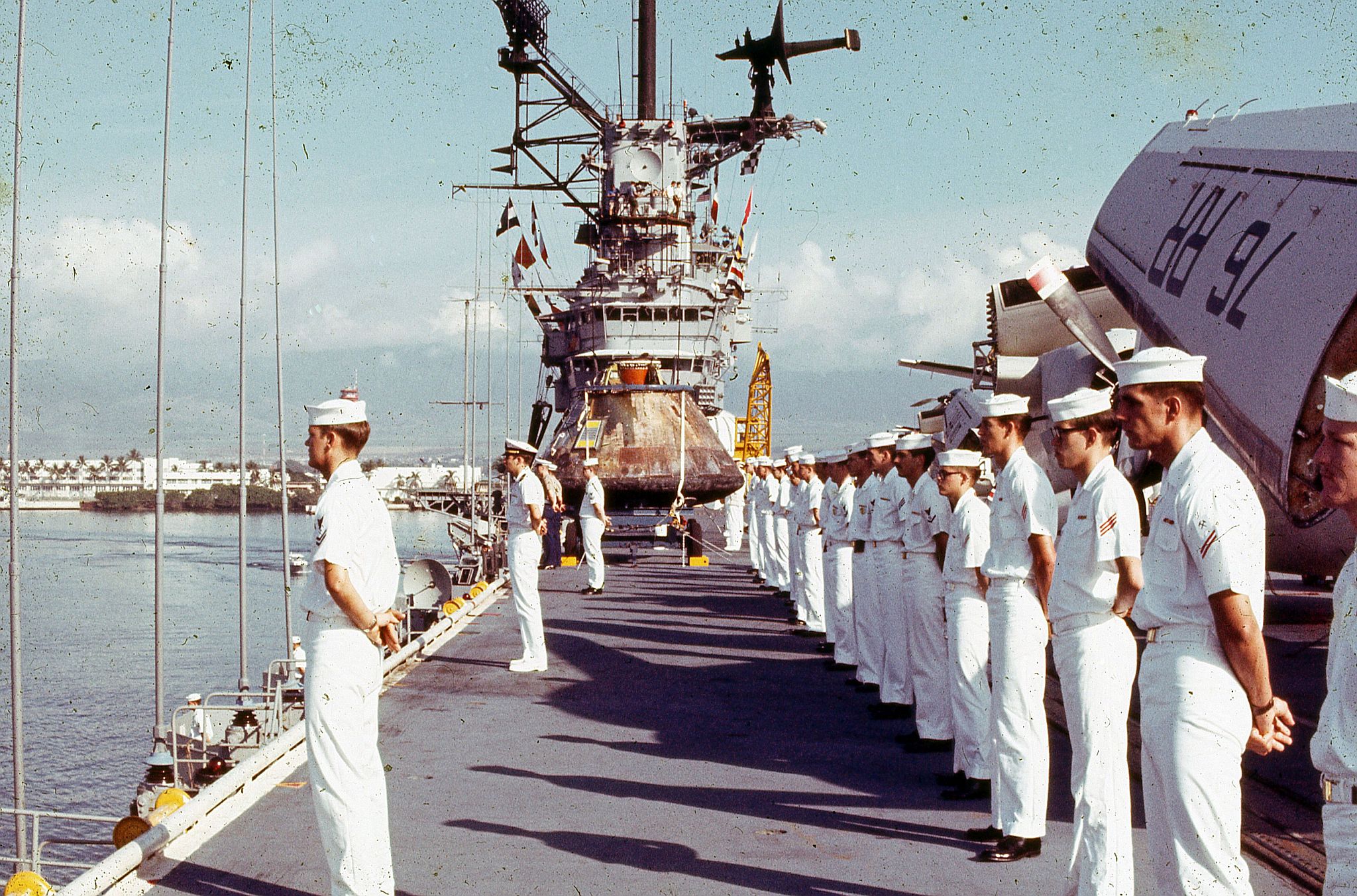 531k | Crewmen man the rails of USS Hornet (CVS-12) as the carrier arrives in port at Pearl Harbor, Hawaii, with the Apollo 12 Command Module and the three astronauts aboard, Friday, 28 November 1969. Naval History & Heritage Command (NH&HC) photo K-80892. |