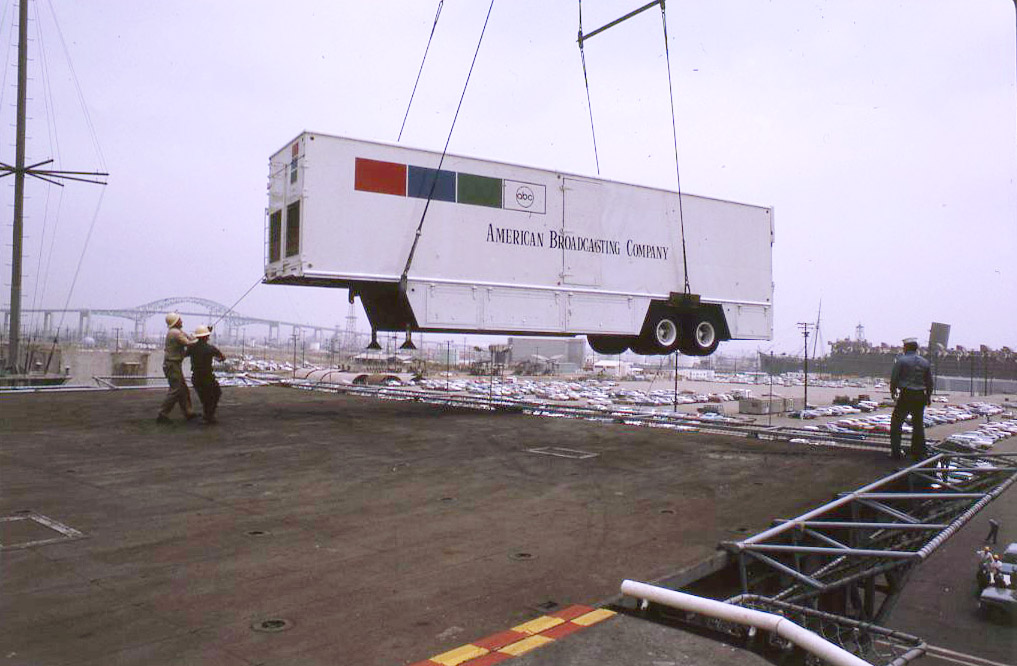 162k | ABC had two mobile semi-trailers with tons of video recording and editing equipment in them (along with cameras, etc.). They were redundant, in case one had a problem. This photo shows one of them being loaded aboard at Long Beach. |