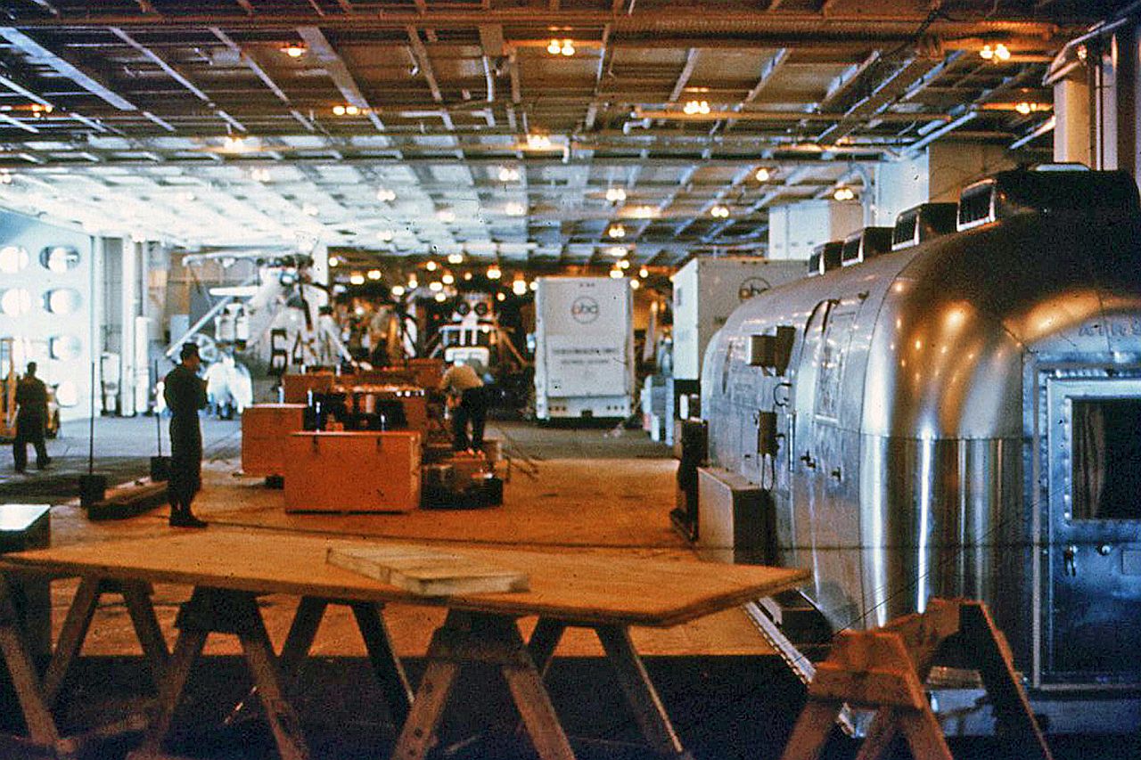 275k | This photo shows both vans (see above) chained down in front of the secondary Mobile Quarantine Facility (MQF) in Hangar Bay 1. The HS-4 astronaut recovery Sea King helo # 66 is sitting next to them with helo #64 by the port side elevator—it was an Underwater Demolition Team (UDT) helo. Helicopter Anti-Submarine Squadron Four (HS-4), nicknamed "Black Knights," was assigned to Carrier Anti-Submarine Air Group 59 (CVSG-59) from late 1968 through the spring of 1970. During that period, HS-4 participated in and pioneered Search and Rescue (SAR) techniques for the Apollo capsule recoveries. The Black Knights were on-scene for Apollo missions 8 (aboard USS Yorktown (CVS-10)), 10 (USS Princeton (LPH-5)), 11 and 12 (USS Hornet (CVS-12)), and 13 (USS Iwo Jima (LPH-2)). The recovery was always made by one of the most recognized helicopters of all time, "Helicopter 66," whose actual serial number was BuNo 152711. After the Apollo 11 recovery the U.S. Navy adopted a three-number squadron designator and the helicopter's side number was changed several times—however, the helicopter always bore the number "66" for public relations reasons. HS‑4 was awarded a Meritorious Unit Commendation (MUC) for these recoveries. |