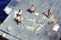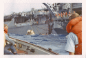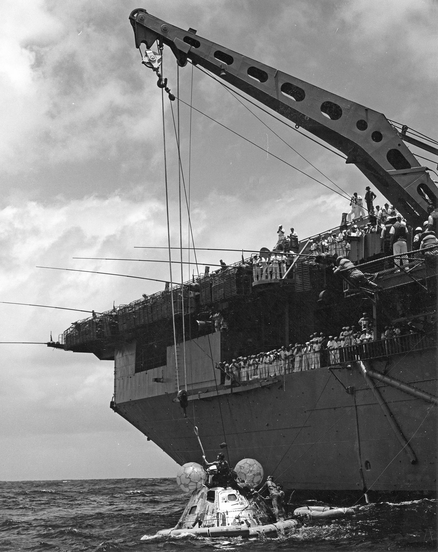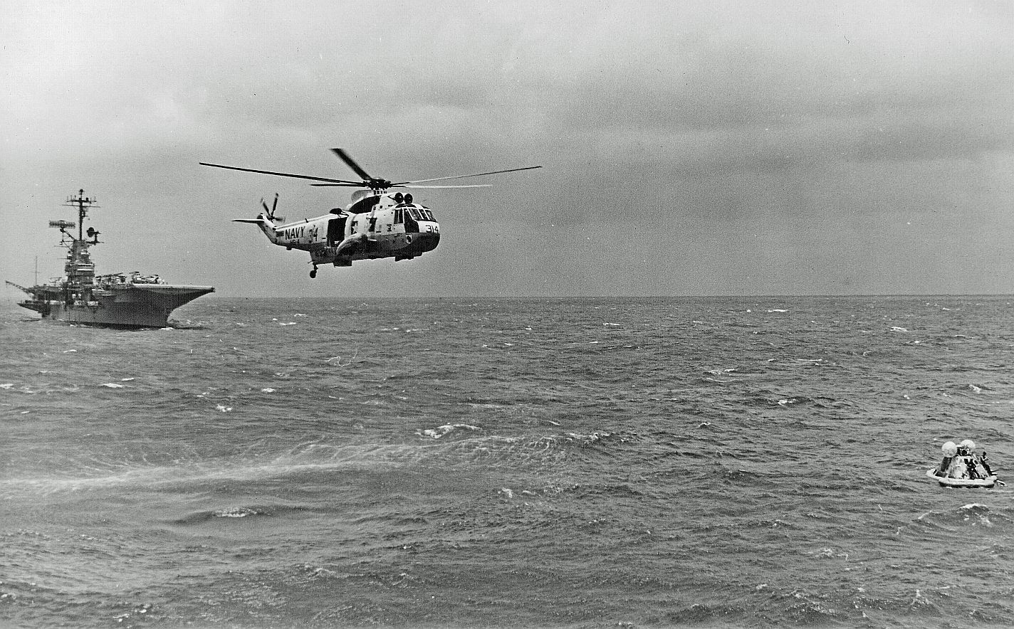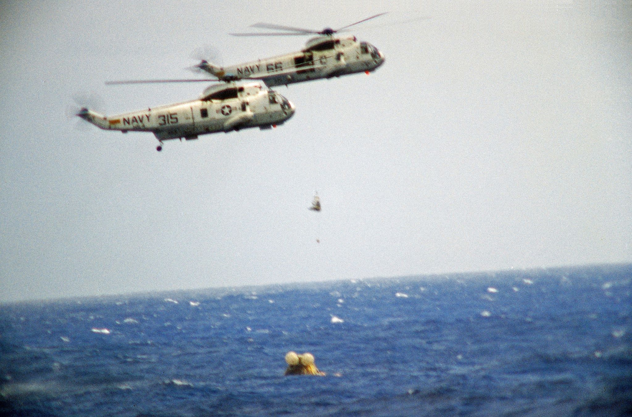 1006k | During the 8-day Apollo 11 space flight, Hornet conducted 26 Simulated Recovery Exercises (SIMEX). A SIMEX always began with Hornet dropping the NASA boilerplate into the water and steaming a short distance away. Various helicopters, Underwater Demolition Teams (UDT), and crane operations were then practiced to ensure the real recovery would be flawless. In addition to using the ship's Boat and Aircraft (B&A) crane to recover the Command Module (CM), the bright yellow aircraft crash crane (Tilly) was also tested. "Practice" was considered a critical success factor for NASA since no one had ever walked on the moon before. US Navy photo by PH2 Milt Putnam. |