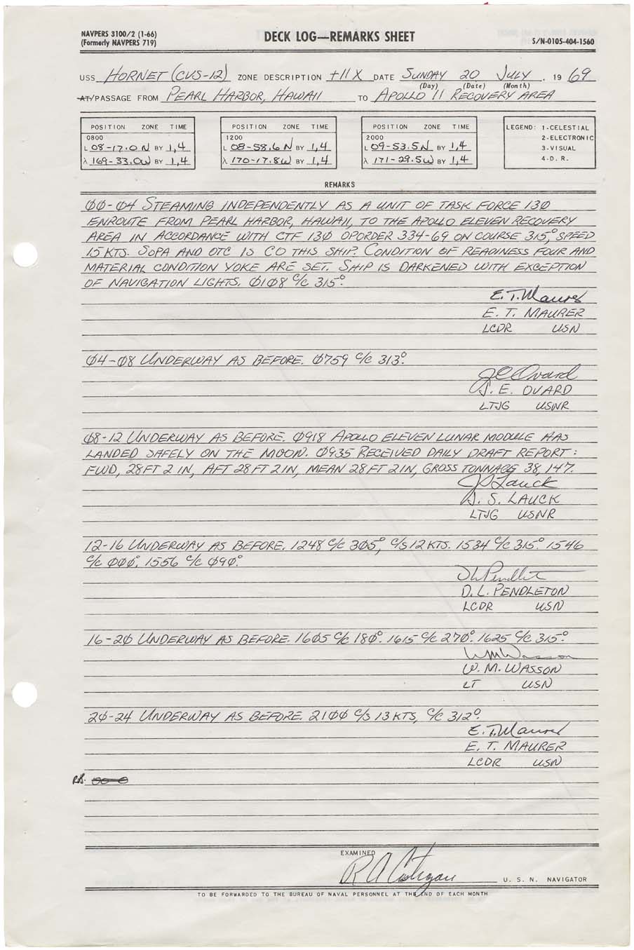 199k | USS Hornet (CVS-12) Deck Log, 20 July 1969, the day Apollo 11's Lunar Module (LM) Eagle landed on the Moon. |