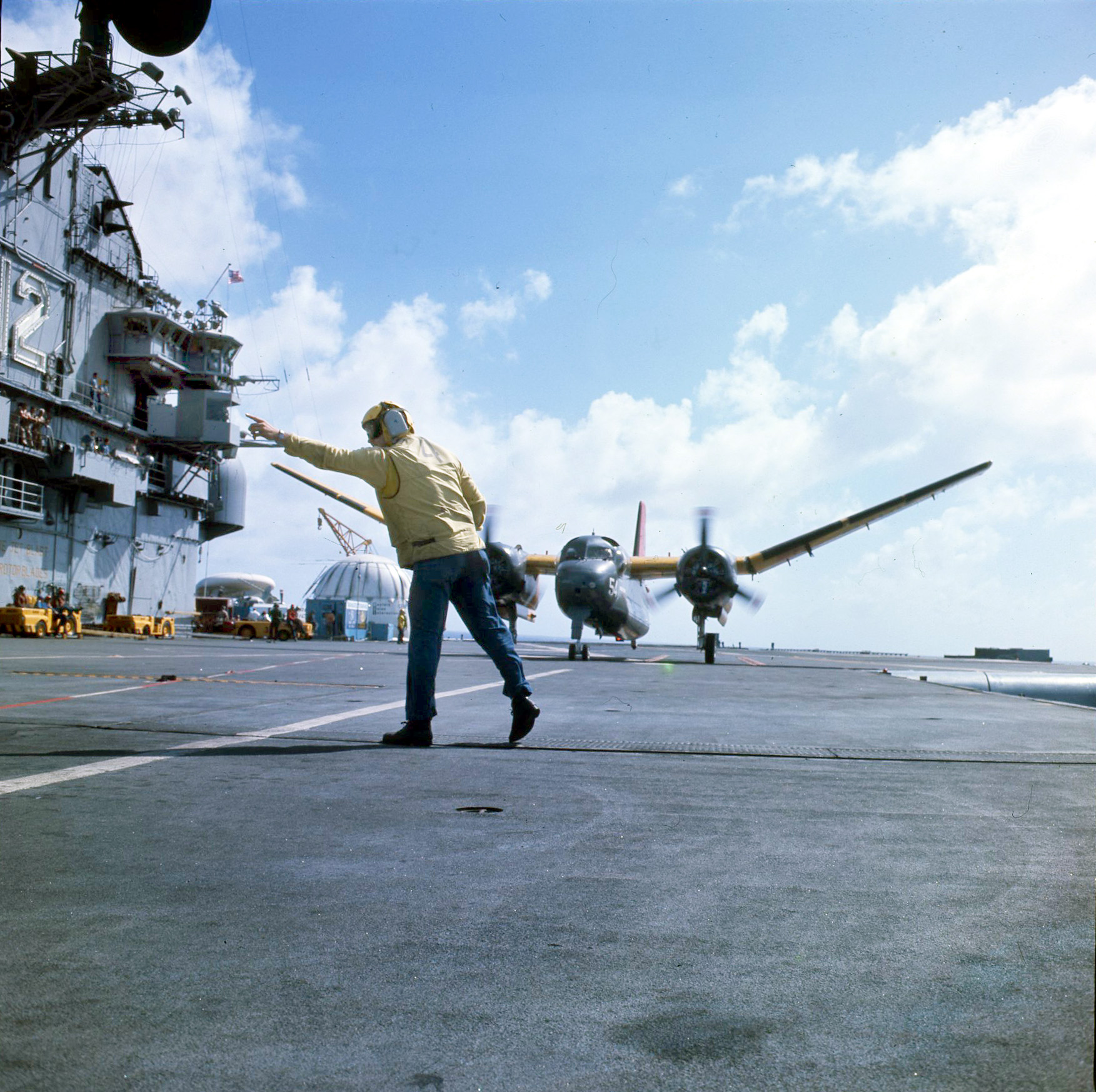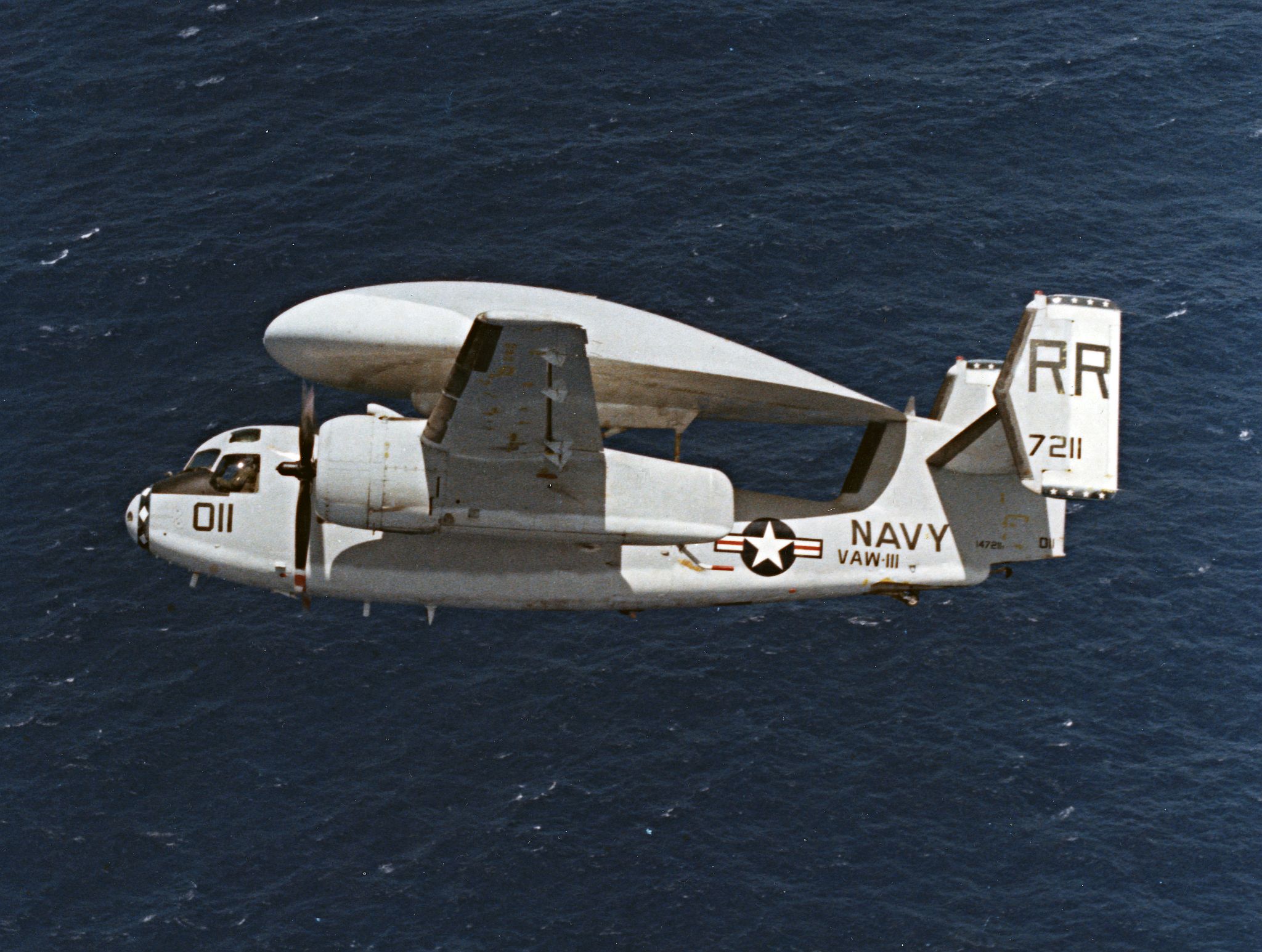 339k | Carrier Airborne Early Warning Squadron (VAW) 111 Det. 12 "Hunters" was called upon to provide four E-1B Tracers, with crews and support personnel, to assist in the recovery of Apollo 11. The E-1Bs were assigned two separate and distinct missions requiring three out of the four aircraft to be airborne simultaneously. One aircraft, "Airboss One," was assigned as Air On-Scene Commander until such time as the PRS, USS Hornet (CVS-12), could assume those duties. In addition, Airboss One provided radar air control of the recovery, swim and photo helicopters during night and IFR recovery operations. A second E-1B, "Relay One," was assigned to relay communications between the PRS, the command module and the recovery aircraft to CTF-130. The third E-1B, "Airboss Two," served as an airborne standby for either of the other two E-1Bs, as well as being able to assist in search operations if needed. (From VAW-111 Det. 12 Ops Summary.) NS-ha-801: One of the Tracers, BuNo 148127, modex RR769, in flight. NS-ha-801a: BuNo 147211, modex RR011, (Airboss ONE?). |