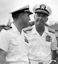 341k | Recovery operations for all NASA missions that splashed down in the Pacific Ocean were managed by Task Force 130, headquartered in Kunia, HI. RADM Donald Davis (r) was the CO in July 1969 when the Apollo 11 mission occurred. The CO of the Primary Recovery Ship USS Hornet (CVS-12), Captain Carl Seiberlich (l), was also the Commander of all Pacific Ocean recovery forces assigned to that space mission. US Navy photo. |