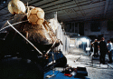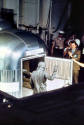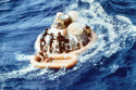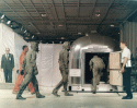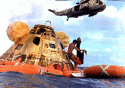439k | A close-up photo of a SIMEX. After the UDT "practice astronauts" had been hoisted into the recovery helicopter, the UDT swim team that stabilized the spacecraft is now preparing the boiler plate to be recovered. The person in the green Biological Isolation Garment (BIG) suit is the UDT decontamination swimmer, LTJG Clancy Hatleberg. At this moment they are waiting for Hornet to pull nearby and crane the capsule out of the water. US Navy photo. |