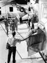 548k | USS Hornet crewmen are greeted by the crew of the Apollo 12 lunar landing mission as the three astronauts are transferred from a US Navy helicopter to a Mobile Quarantine Facility (MQF) aboard the prime recovery vessel. Charles Conrad Jr., right, commander; Richard F. Gordon Jr., command module pilot, left front; and Alan L. Bean, lunar module pilot, splashed down safely at 1458, 24 November 1969. NASA flight surgeon in the orange flight suit following the astronauts out of helo 66 is Dr. Clarence Jernigan. The NASA MQF technician holding the MQF door is Randy "Brock" Stone. (Thanks to Bob Fish.) National Aeronautics and Space Administration (NASA) photo S69-22849. |