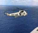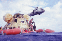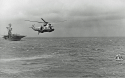 348k | Apollo 12 Primary Recovery Ship USS Hornet (CVS-12) begins a slow approach to recover the Command Module (CM), Yankee Clipper. While the UDT-13 swimmers stand on the CM flotation collar, an HS-4 Sea King helicopter (see below) acts as a navigational beacon for the ship's CO, Captain Carl Seiberlich. US Navy photo by PH3 Ralph G. Howard. |