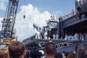 951k | On 16 July 1969 at 9:32am EDT, the Saturn V carrying the Apollo 11 spacecraft and crew blasted off from Kennedy Space Center. After one and a half orbits of the earth, the S-IVB booster rocket was fired just west of the Gilbert Islands in the southwest Pacific, inserting the spacecraft into a lunar orbit. It was night time and a few personnel on Hornet watched an unusual event—a "meteor" ascending into the heavens overhead. Apollo 11 was on its way to the moon. National Aeronautics and Space Administration (NASA) photo, # 6901001. |