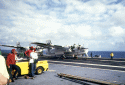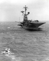 45k | A rare photograph taken by one of Hornet's Photo Lab photographers from the flight deck. The Primary Recovery Ship was so close to the EOM (End Of Mission) point that Yankee Clipper, Apollo 12's Command Module, could be seen and photographed just before splashdown. |