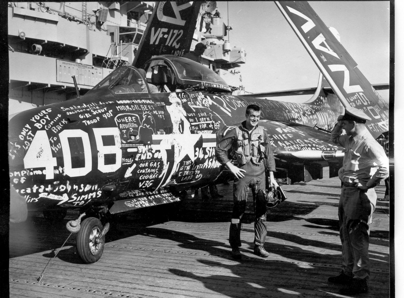 This pilot of an F2H-2 Banshee of VF-34 landed on the wrong ship after an exercise. The next day he came home after a rousing sendoff from the other ship. Latter part of 1952. In all probability the "other" carrier was USS Franklin D. Roosevelt. VF-171 and -172 were the Banshee squadrons aboard FDR at that time. Even Leyte's Air Group 3 tail code ("K") was repainted to look like that of FDR's Air Group 17 ("R".) And if you read the graffiti you'll find references to "Miss FDR" and "FooDeeRoo" (a nickname of Franklin D. Roosevelt). |
