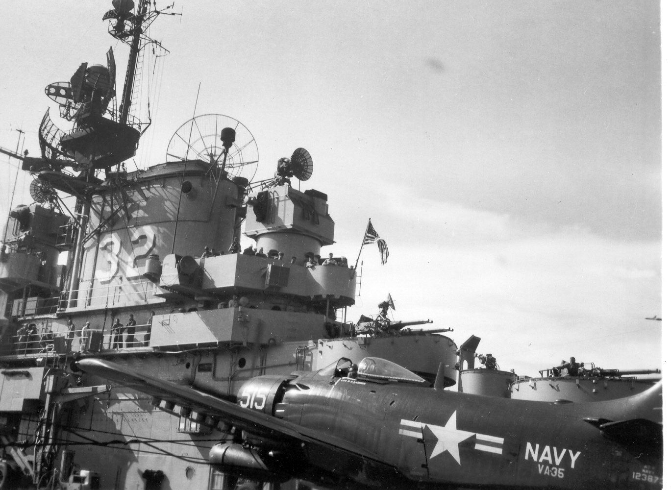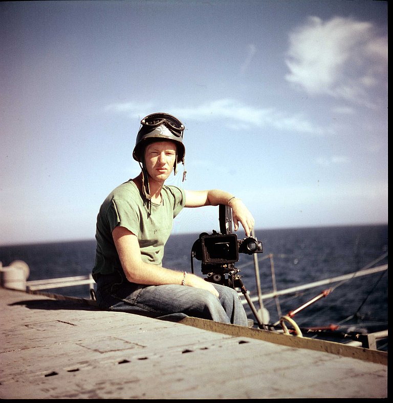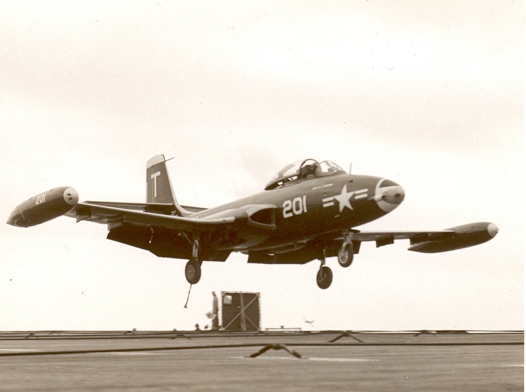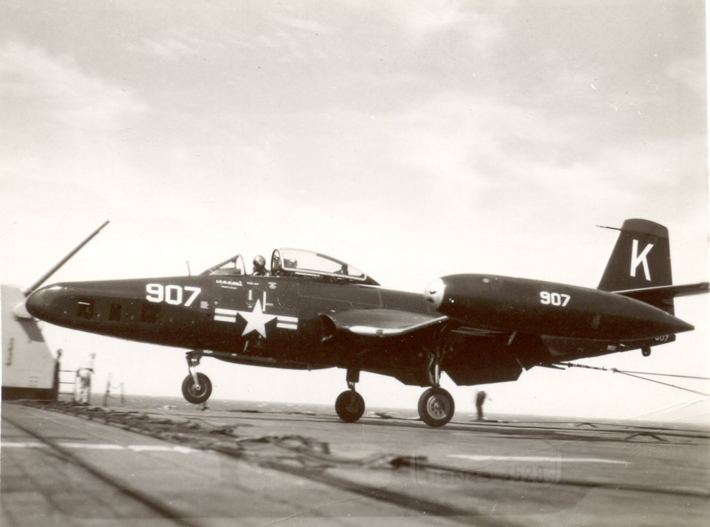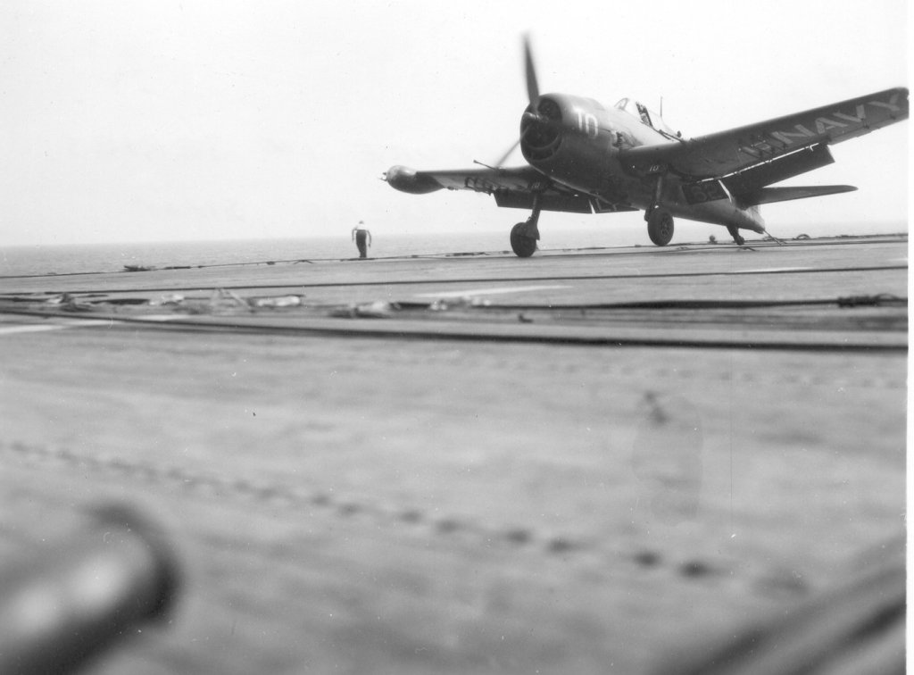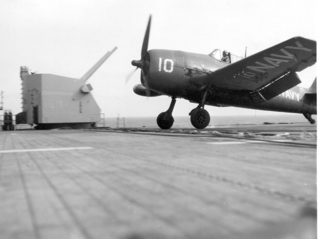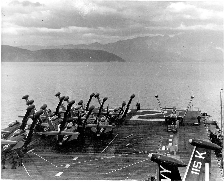 "I was stationed aboard the USS Leyte for just about all of 1952. The ship did some operations off the East coast and made a cruise to Nova Scotia with a load of Naval Academy cadets and in mid year we left for a deployment in the Mediterranean. I left the ship in mid December to travel back to Norfolk in time to be discharged a few days before Christmas 1952. My job aboard the ship was to man a station on the starboard side of the flight deck about where the second wire was located and photograph anything unusual that was happening. There were other camera positions that were also used. I took some of the photos [shown here] and I saw many of the events that were photographed, but obviously I wasn't always in the right place to get the shot."