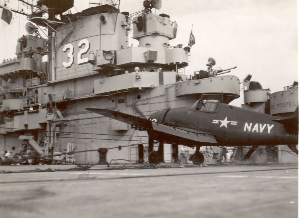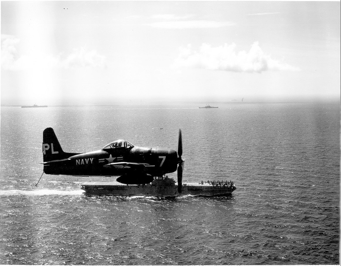256Kb | F8F-2P Bearcat of Composite Squadron 62 (VC-62) above USS Leyte. A heavy cruiser and a Midway-class aircraft carrier steam in the background. Possibly taken in 1951. |