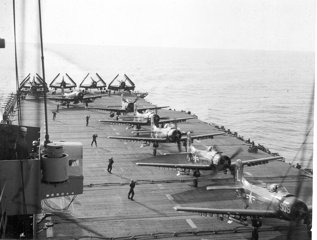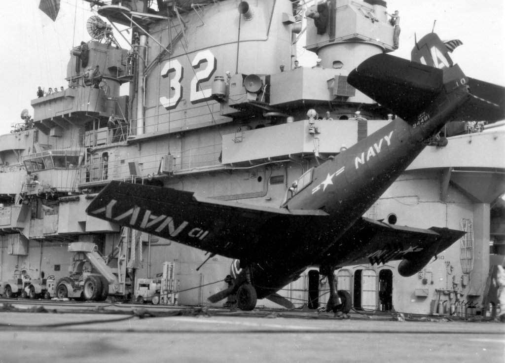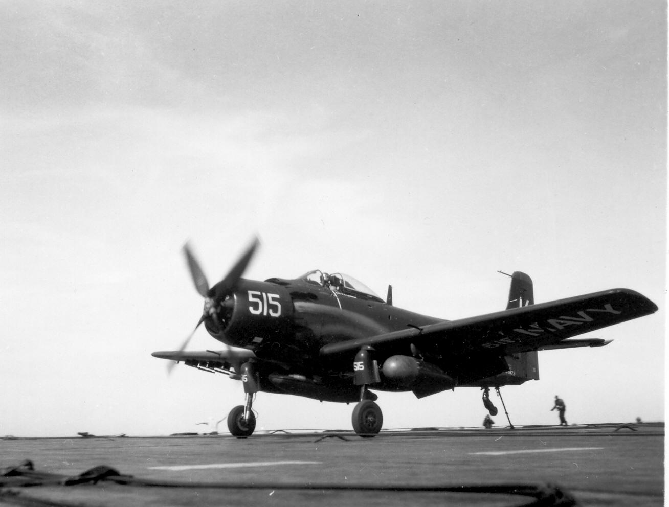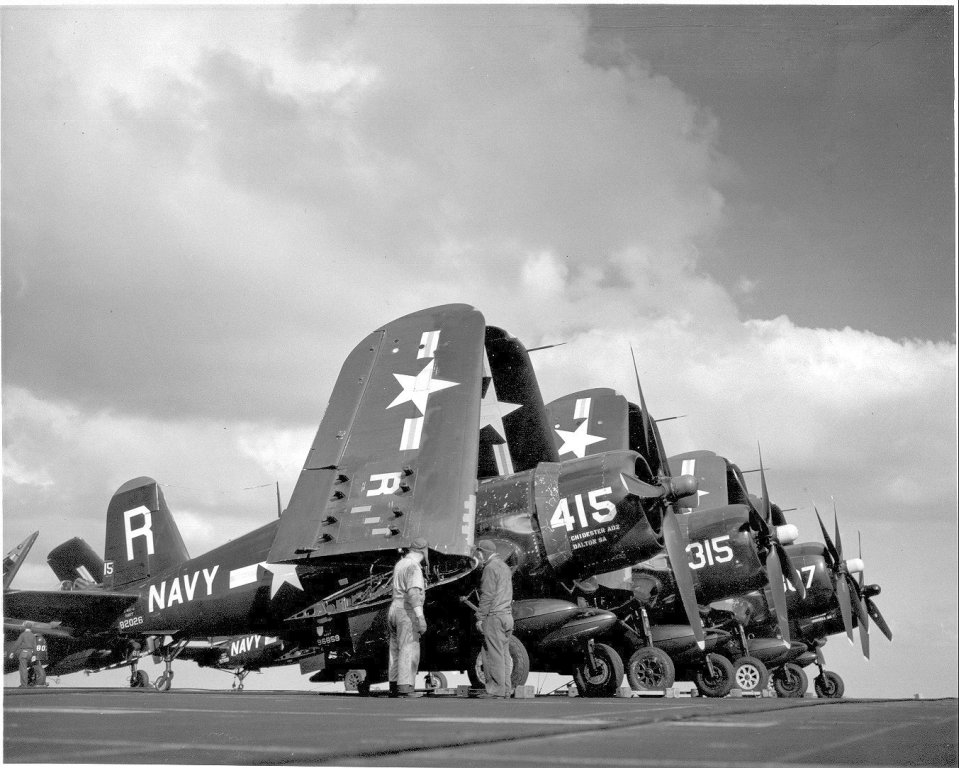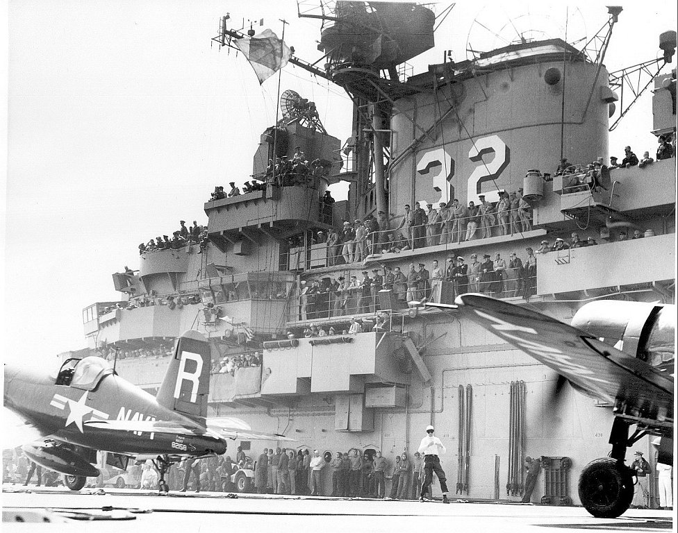 212Kb | F4U Corsairs of Carrier Air Group 17 (CVG-17) about to take off. CVG-17 (established as CVG-82 in April 1944, redesignated CVAG-17 in November 1946 and CVG-17 in September 1948) deployed twice with USS Franklin D. Roosevelt in 1951–1952, and never deployed overseas aboard Leyte. |
