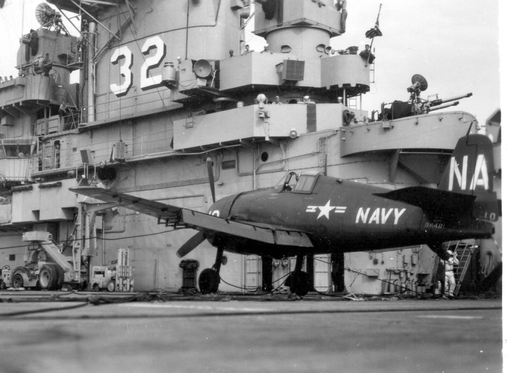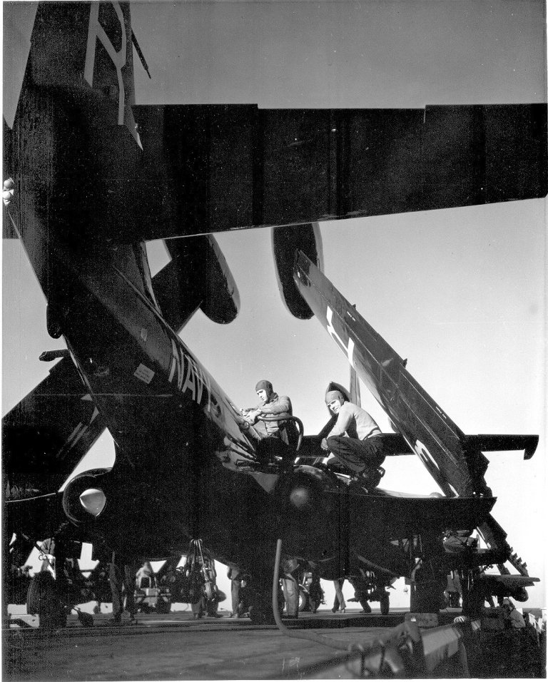 127Kb | F4U Corsairs of Carrier Air Group 17 (CVG-17) on flight deck, circa 1951. Plane closest to camera is F4U-4 BuNo 82026. |