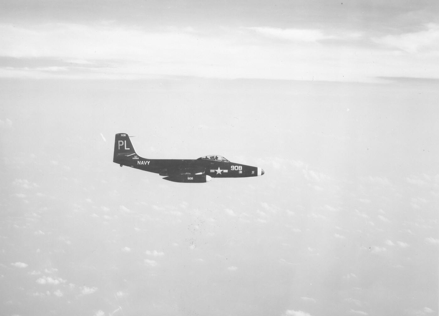 80Kb | A F2H-2P, the photo version of the Banshee, photographed in April 1952. It carried three cameras in that extended nose. Two were side-looking and the other was vertical. As a little trivia about the Banshee: in heavy seas the planes came in high and cut power and dropped like stones onto the deck. I saw a Banshee drop down and have both wheel struts come completely through the wings. |