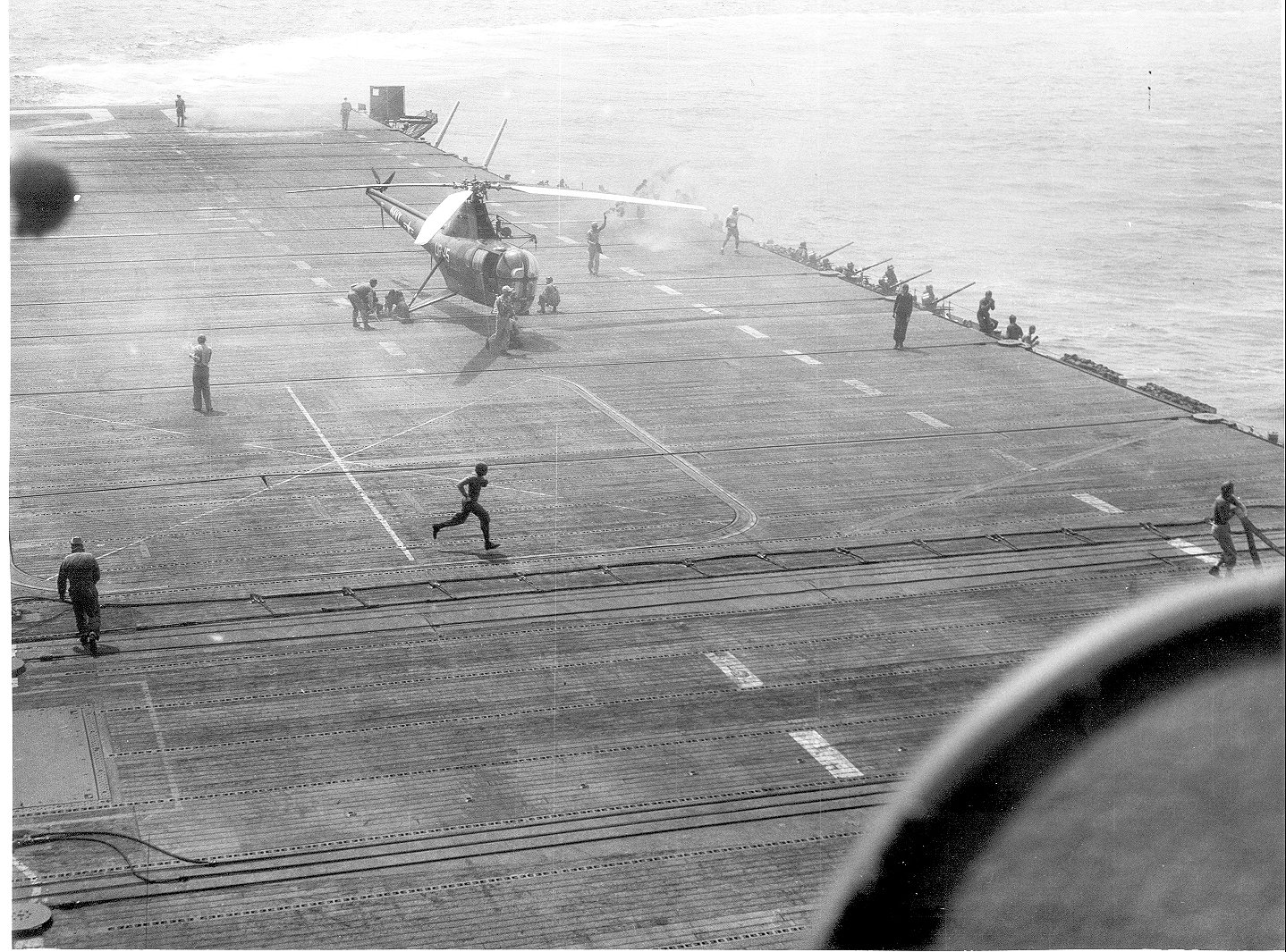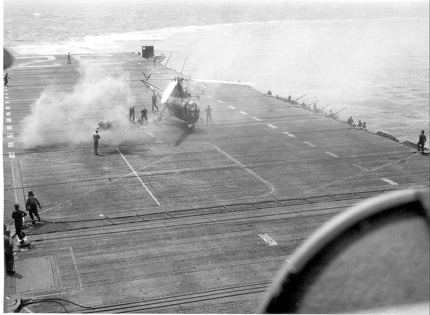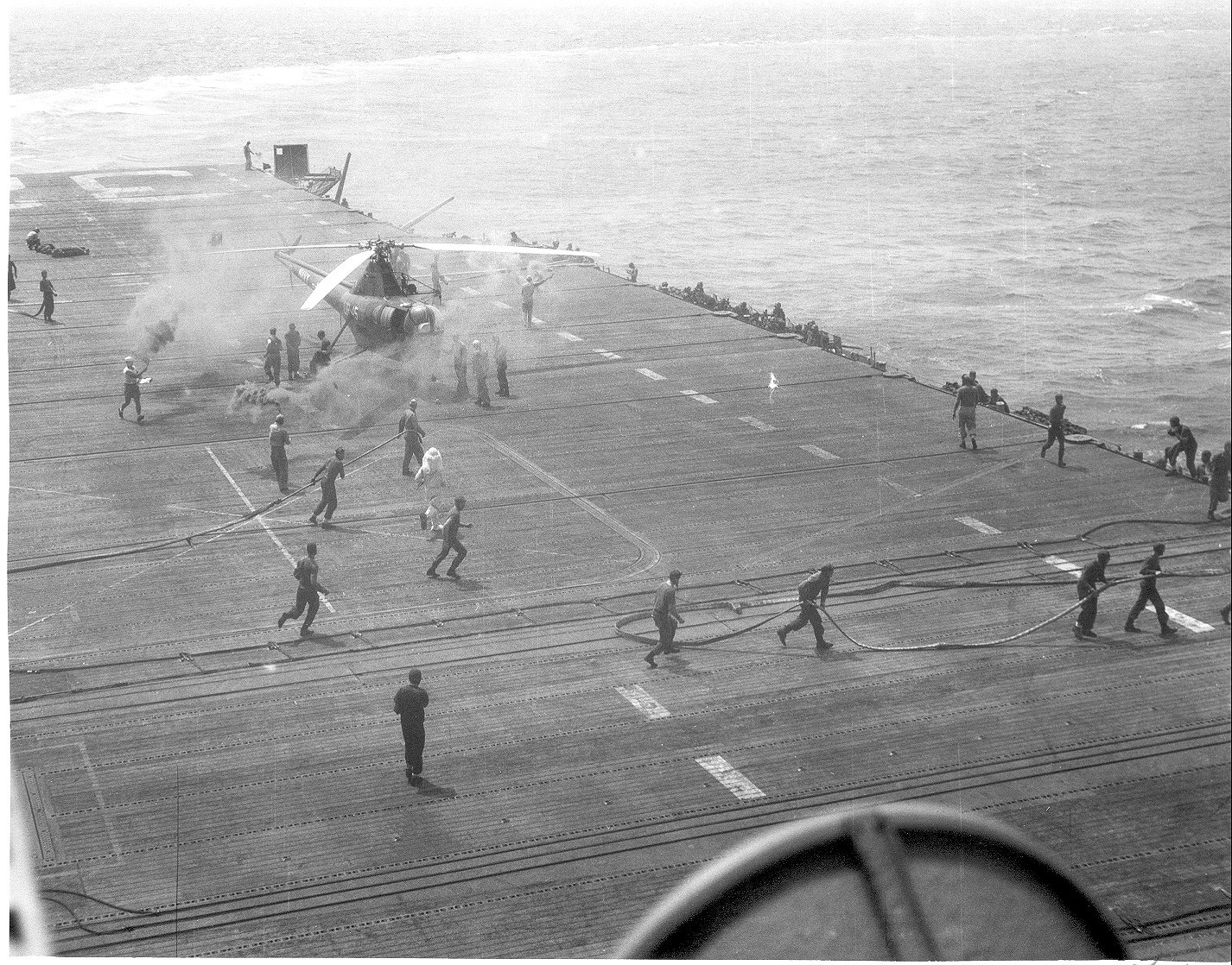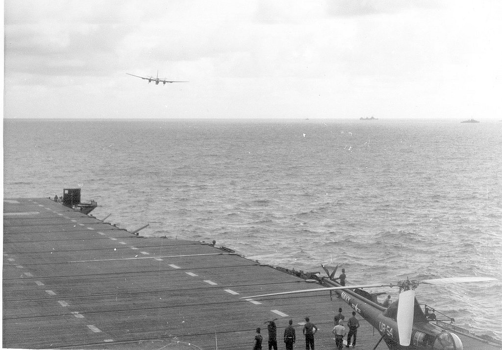 156Kb | Overflight by 2-engine aircraft, date and place unknown. Note HU-2 "Fleet Angels" HO3S-1 helicopter on deck. |