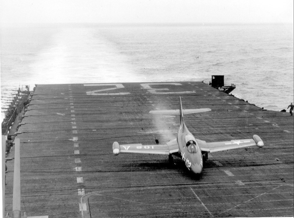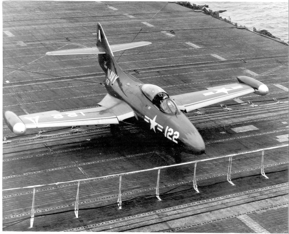 198Kb | F9F-2 Panther #A-122 landing, date and place unknown. Note jet barrier in position. This plane was assigned to VF-721 "Iron Angels," a reserve squadron called to active duty on July 20, 1950, and part of Carrier Air Group 101 (CVG-101.) On February 4, 1953 VF-721 was redesignated VF-141, and CVG-101 was redesignated CVG-14. |