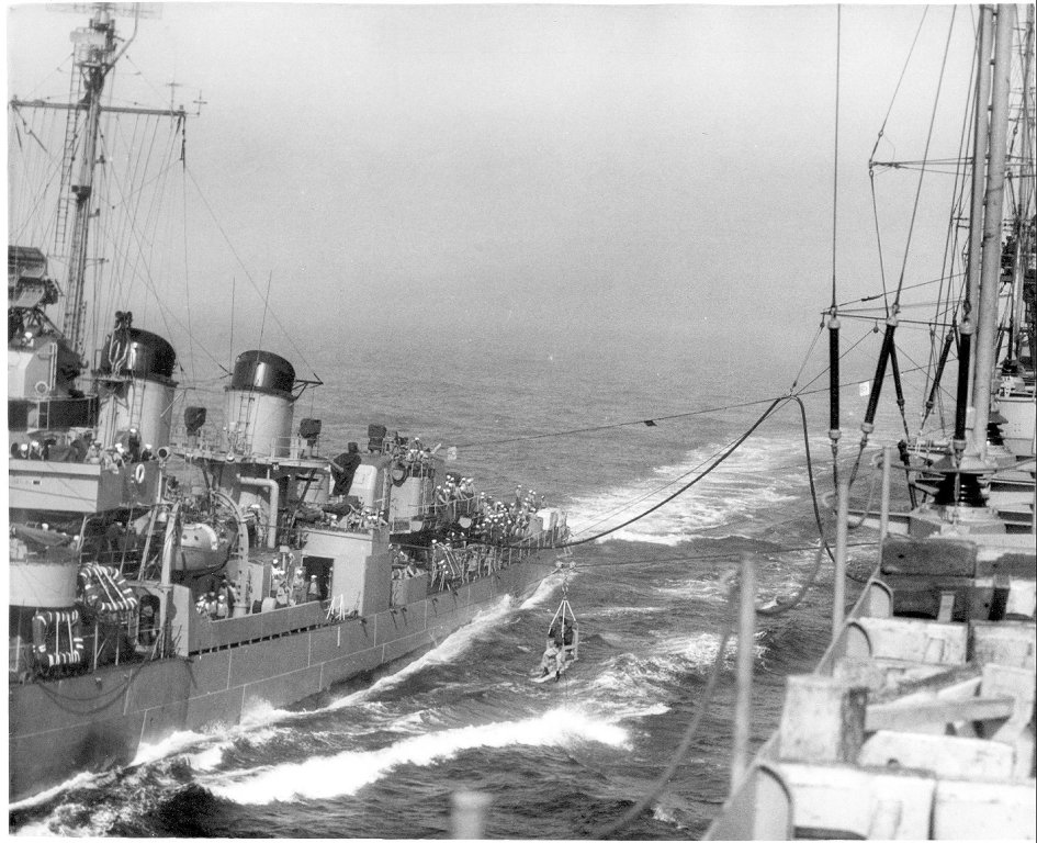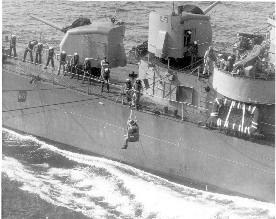 188Kb | Taking a man aboard from an unidentified destroyer, via high line. Date and place unknown. |
