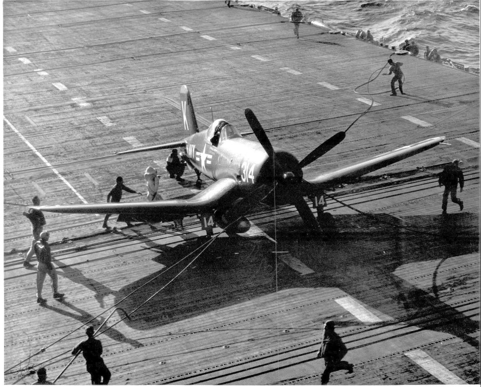 168Kb | F4U Corsair, side number 305, moving toward catapult. Location and date unknown. |