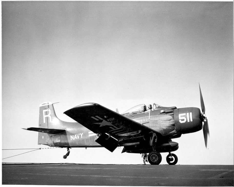 106Kb | AD-4 Skyraider BuNo 123856, #R511, catching a wire, date and place unknown. This plane belonged to VA-175 "Hell Razors," part of Carrier Air Group 17 (CVG-17). |