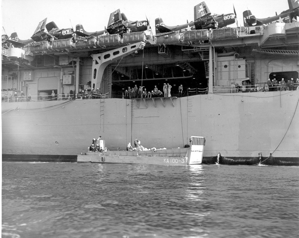153Kb | Taking on provisions in port, probably fresh fruit and vegetables. Note LCM from Oglethorpe (AKA-100) alongside, AD Skyraiders from VC-33 (tail code "SS") and VC-12 ("NE") parked on the flight deck. |