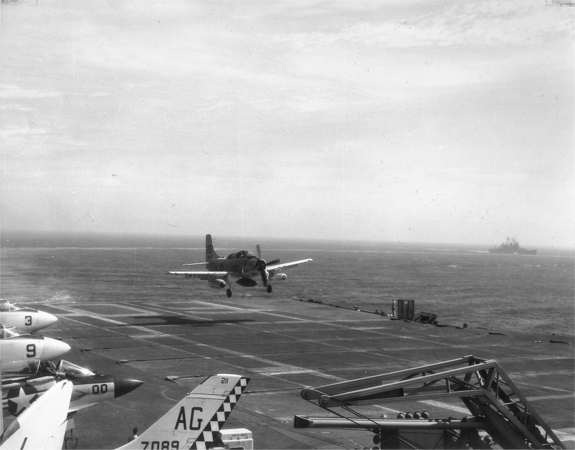 ![]() NS-cv60-ph03 AD-5N Skyraider, VA(AW)-33 Det. 43 "Night Hawks," recovering aboard, probably in 1957. A3D-2 Skywarriors and F3H-2M Demons are parked on the flight deck. 450Kb |