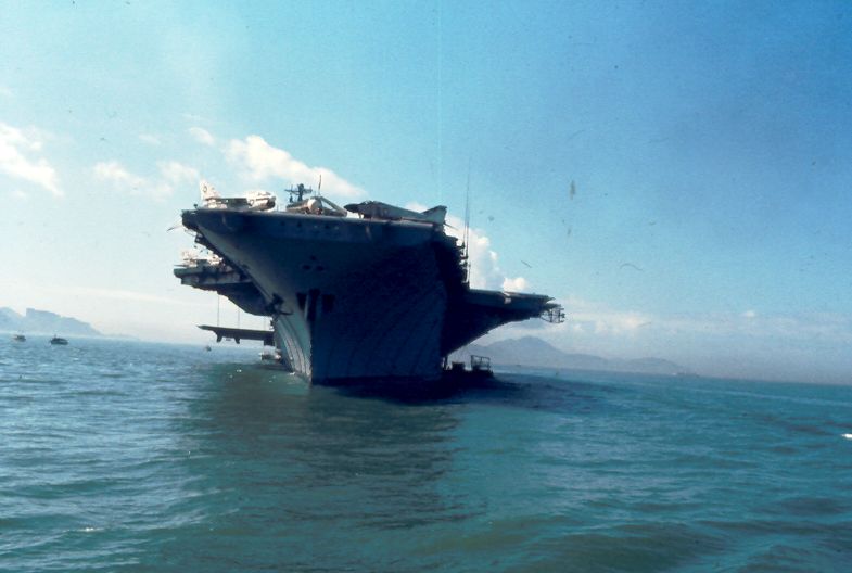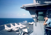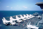 ![]() A-7E Corsair IIs. Note F-4J Phantom II launching from one of the waist catapults. NS-cv66-lmrh51 |