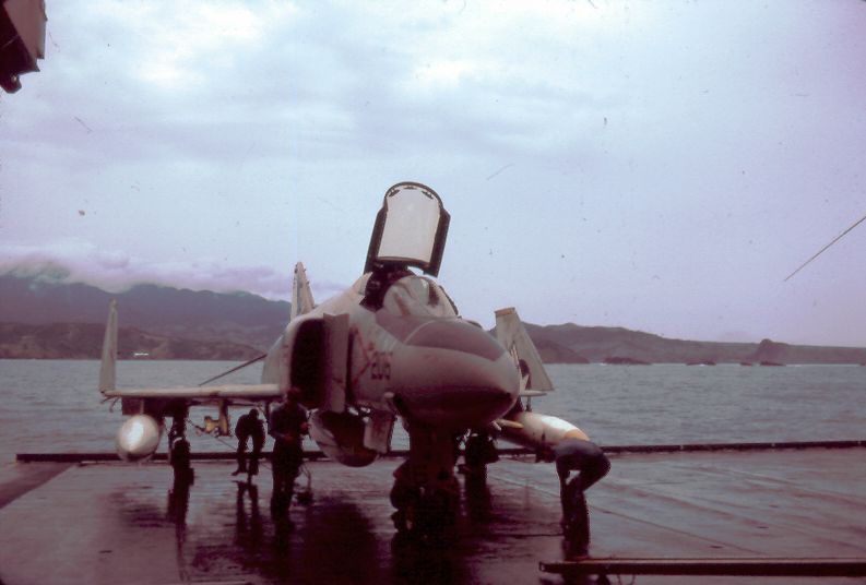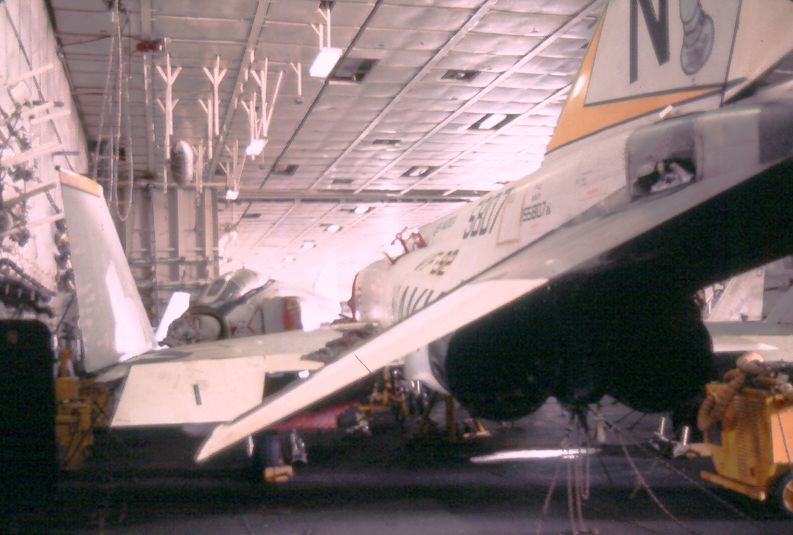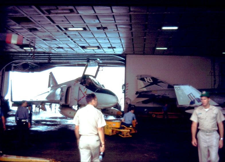 ![]() F-4J Phantom II (BuNo 155807, modex NG-201), VF-92 "Silver Kings," in hangar bay #2. NS-cv66-lmrh45 |