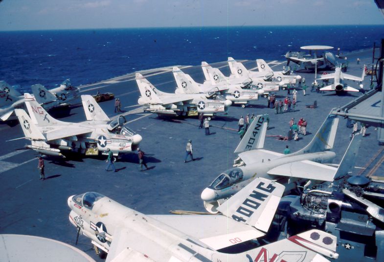 ![]() A-7E Corsair IIs and a single E-2A Hawkeye, Carrier Airborne Early Warning Squadron (VAW) 124 "Bullseye Hummers." NS-cv66-lmrh50 |