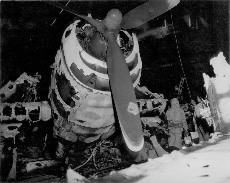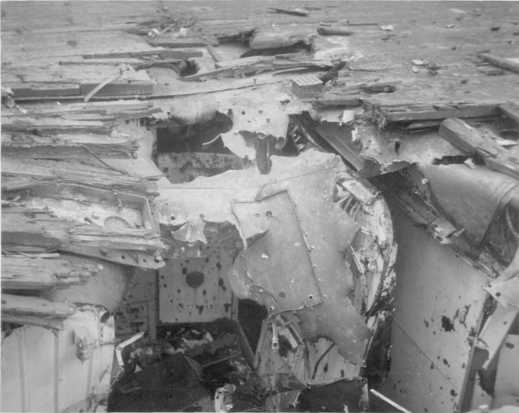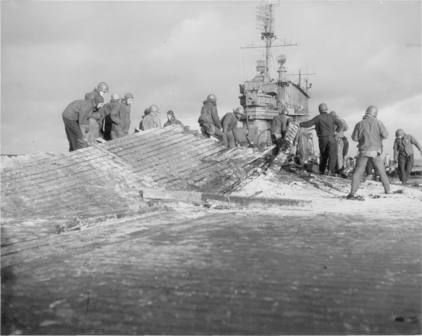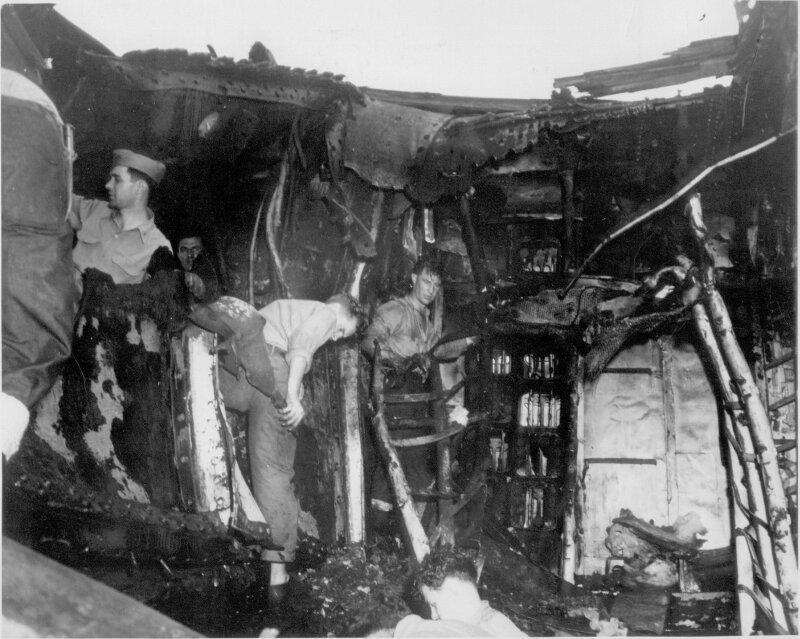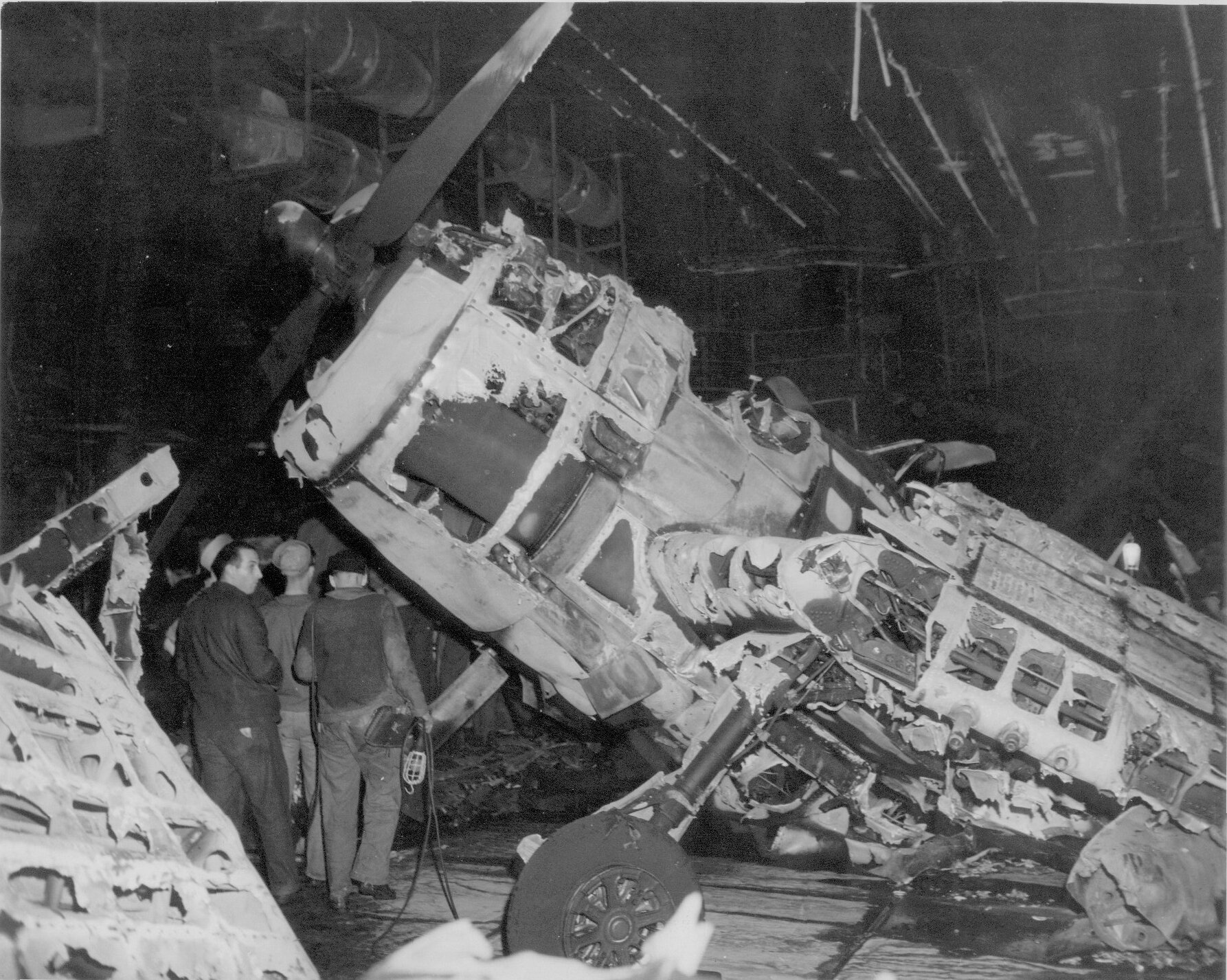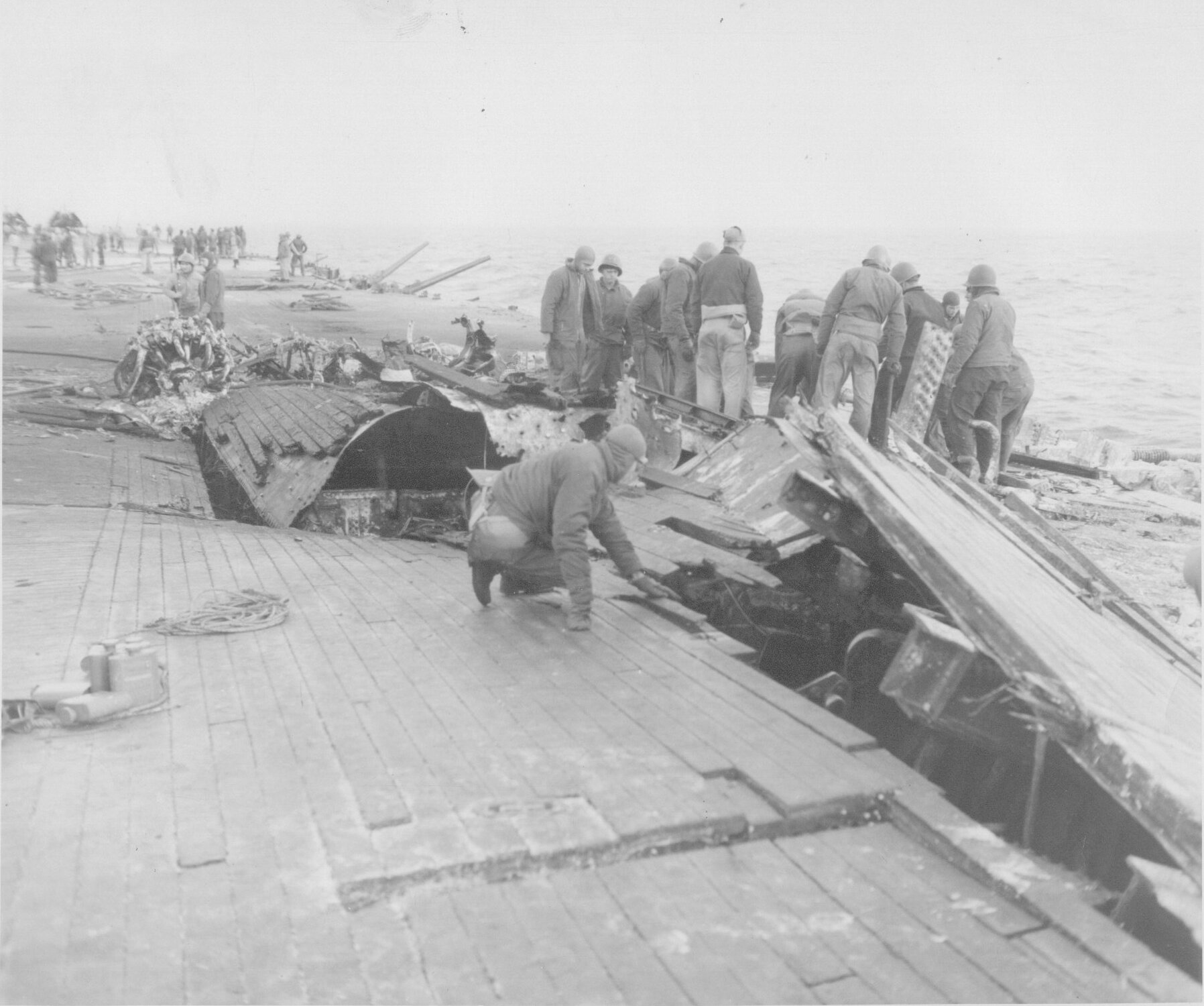 135k | "Wreckage of F6F on hanger deck. (Photo CV3 3666 Feb 22 1945)". High Resolution Image 689k |