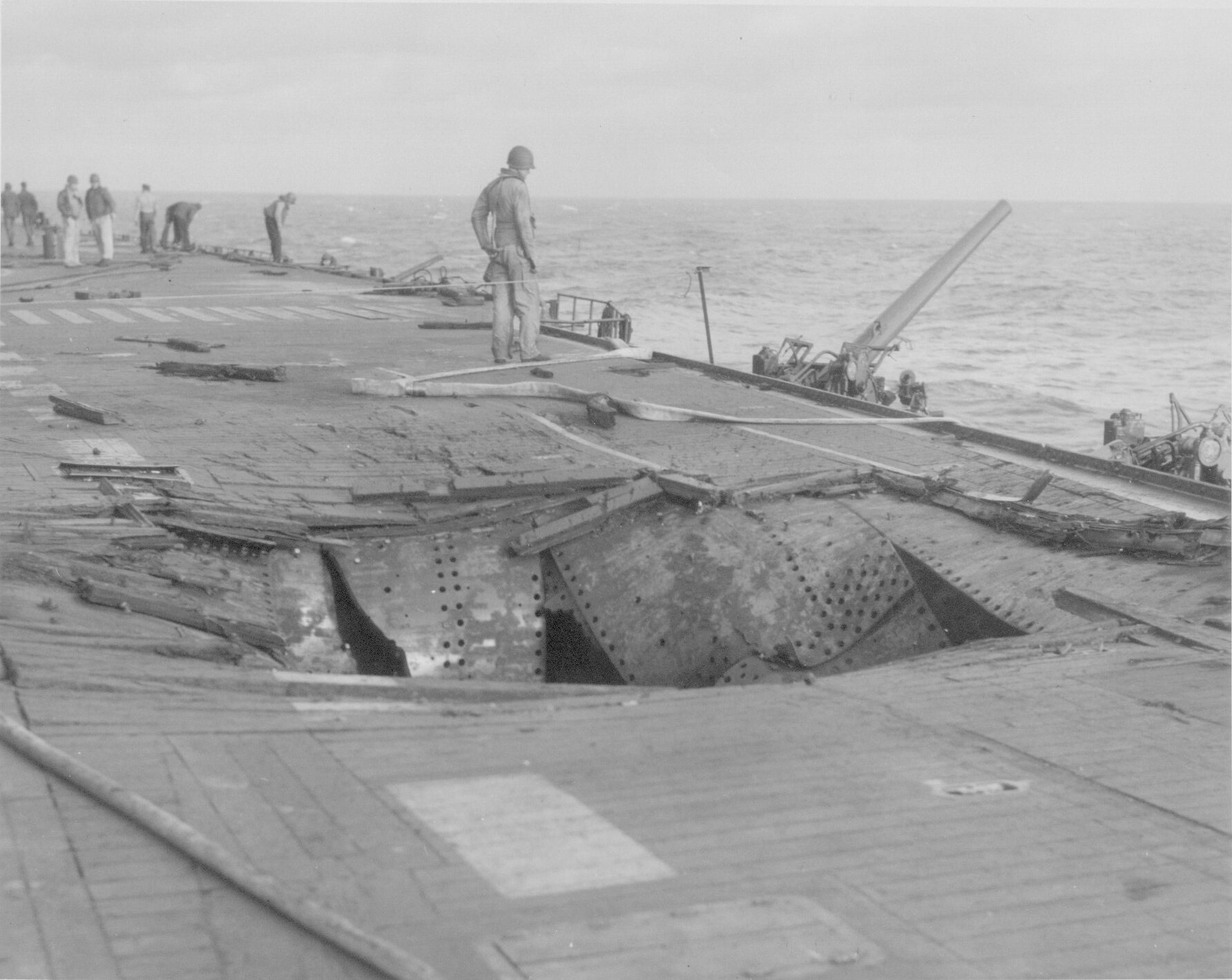 69k | "Feb. 21, 1945 Ruptured flight deck fwd., due to Jap suicide plane. (Photo CV3 3555)" High Resolution Image 293k |