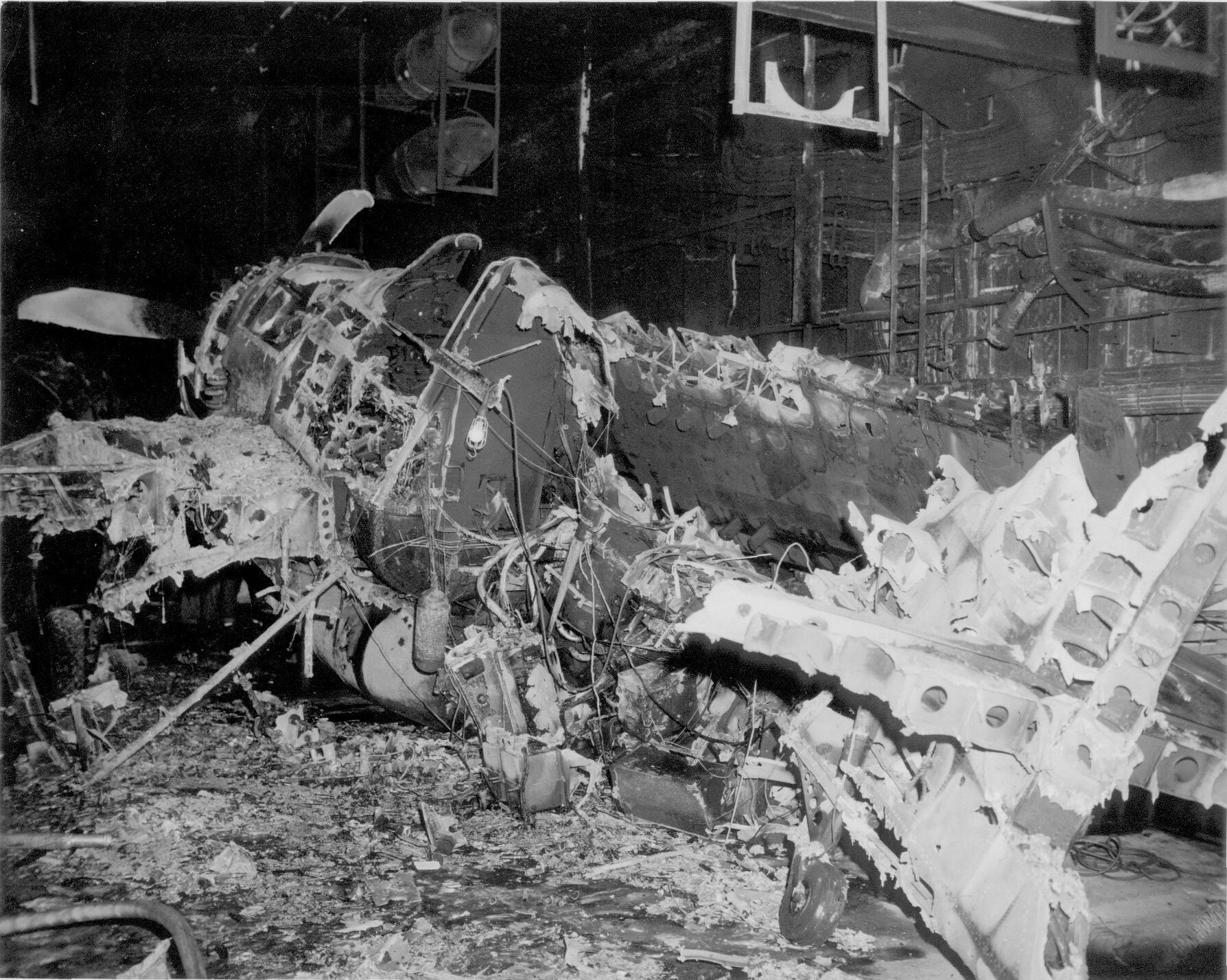 99k | "Burned plane on hanger deck. (F6F) (Photo CV# 3660 Feb 22 1945)". High Resolution Image 583k |