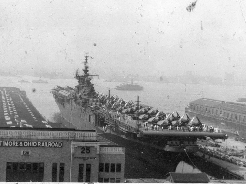 84k | This is a "long-hull" Essex/Ticonderoga-class aircraft carrier moored to Pier 26 North (Hudson) River, New York. Photo was probably taken in 1945 or 1946. Can you identify this ship? (larger image available on request.) This ship is possibly USS Lake Champlain (CV-39) (Thanks to Harry Wood, ADJ3, CVS-39, 1962–1964.) "Returning to the east coast [September 1945], she held 'open house' for more than 200,000 visitors, demonstrating that their tax dollars and War Bonds had been wisely spent. Lake Champlain was the first ship open to the public since the war started and she was a big hit. Philadelphia, Boston and New York were the cities that hosted our carrier, and many memorable liberties were held." (Jack Sauter, USS Lake Champlain CV/CVA/CVS-39, Turner Publishing Company, 2002.) Note a large number of civilians aboard the ship or awaiting their turn on the pier. Read an analysis of this photo, by David Buell. |