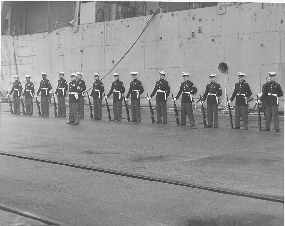 146k | A Marine Honor Guard and what appears to be a decommissioned WW2-style Essex-class carrier in the background. Based on the group of items it was with, this photo might have been taken on the East Coast, in the late 50's or early 60's. Can you identify the ship, date, location or event? (Larger image available on request.) George F. Harrs comments: "USS Tarawa (ATV-12), late '61–early '62, Philadelphia Naval Yard, tied up across the pier from USS Galveston (CLG-3). See photo NH98849 on the Galveston page, you can see Tarawa. I was aboard the Gal. and because of all the top-side work, radar updates, etc., we had a Yard Admiral's inspection (entire crew) on the pier. We had our backs to the Gal., the Marine Honor Guard was facing us with their backs to the Tarawa. I remember the inspection but can’t remember the date. Wish I could be of more help but I’m pretty sure that’s what this is." |