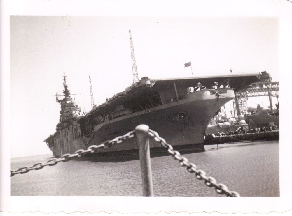 87k | "[A]n aircraft carrier somewhere in the Pacific. [Louis Esposito Sr. took the photo and] served in LST-950." Hints: The combination of "solid" camouflage scheme (Ms. 21), three 40-mm quad mounts below the island, and "early type" island, would point to USS Wasp (CV-18) early in the Okinawa campaign. Just a "possible," not even a "probable." Johan Jungermann, however, notes: "It's a Long Hull carrier, not USS Wasp because Wasp [was a] Short Hull carrier. I believe it's USS Randolph in the Okinawa campaign." Dan DeCosta adds: "Johan is correct, this ship is the USS Randolph." "Only three 'Long Hull' Essex Class ships operated with the Starboard side Hanger Deck 40 mm mounts (added on in early 1945). They were: USS Ticonderoga, USS Randolph, and USS Hancock." "Of those three, USS Ticonderoga had a tall 'mainmast' which rose out of the aft end of her funnel—It was added when she received those extra starboard 40mm mounts. She was the only Essex to have it, and it is not installed on the ship in this photo." "The USS Hancock and USS Randolph were identical in every way except for two details: the Hancock sported dazzle camouflage (measure 32); and the Randolph was painted in the solid dark blue (measure 21)." "The USS Hancock also had an additional SK rectangular radar antenna aft of the main mast that is not in the photo". David Buell comments: "I believe that Dan DeCosta is correct that the unidentified long hull Essex is the Randolph, but for different reasons:" "Boxer CV 21 and Antietam CV 36 need to be considered as candidates for this photo since they were also both in the Western Pacific in the second half of 1945, were painted in Measure 21, and yes, they both had the 40mm sponsons added to their starboard sides. There are photos posted on Navsource on their respective pages confirming this, in spite of common assumption otherwise. Hancock was not in dazzle at this time, however she was painted up in Measure 22 when she received her starboard 40mm sponsons at Pearl Harbor in 1945 after undergoing battle damage. However I agree with the identification by Mr. DeCosta only because the detail on the after side of the island under the #2 MK 37 director on this photo matches Randolph on close photo examination of this area, and both CV 21 and CV 36 differ in this area from CV 15 as well as this photo. I would give this a definite for CV 15." |