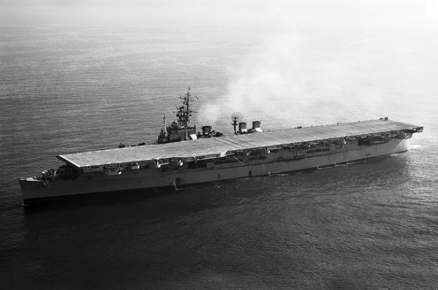 Can you identify the ship, or confirm date/location? (Larger image available on request.) Hints: Number of radio masts along the flight deck. She appears to be a "short-hull" Essex. David Buell notes: