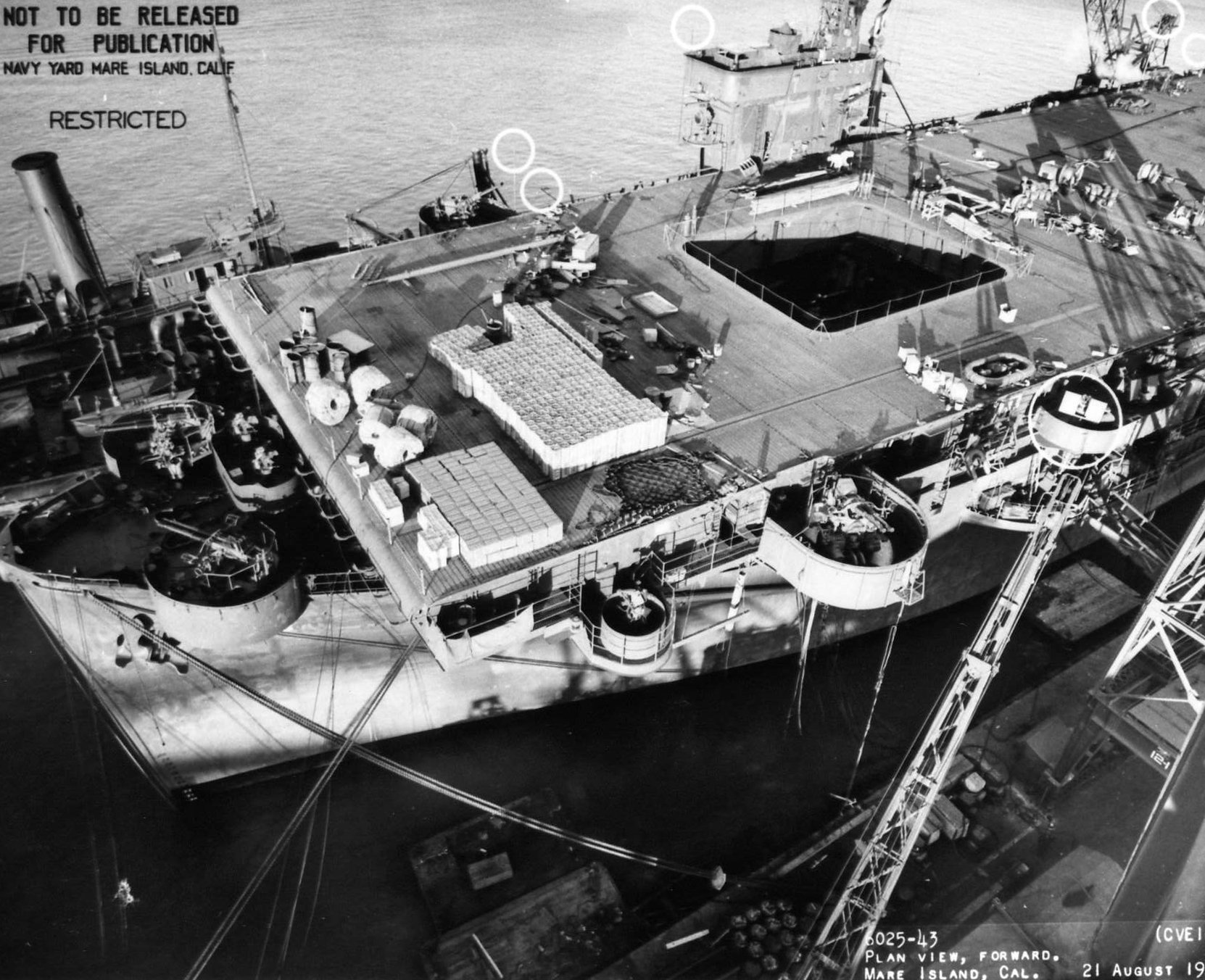 410k | Forward plan view of USS Nassau (CVE-16) at Mare Island Navy Yard on 21 Aug 1943. She was at the yard for repairs from 23 July until 23 Aug 1943. Official Mare Island photo # 6025-43. | Darryl Baker | |
