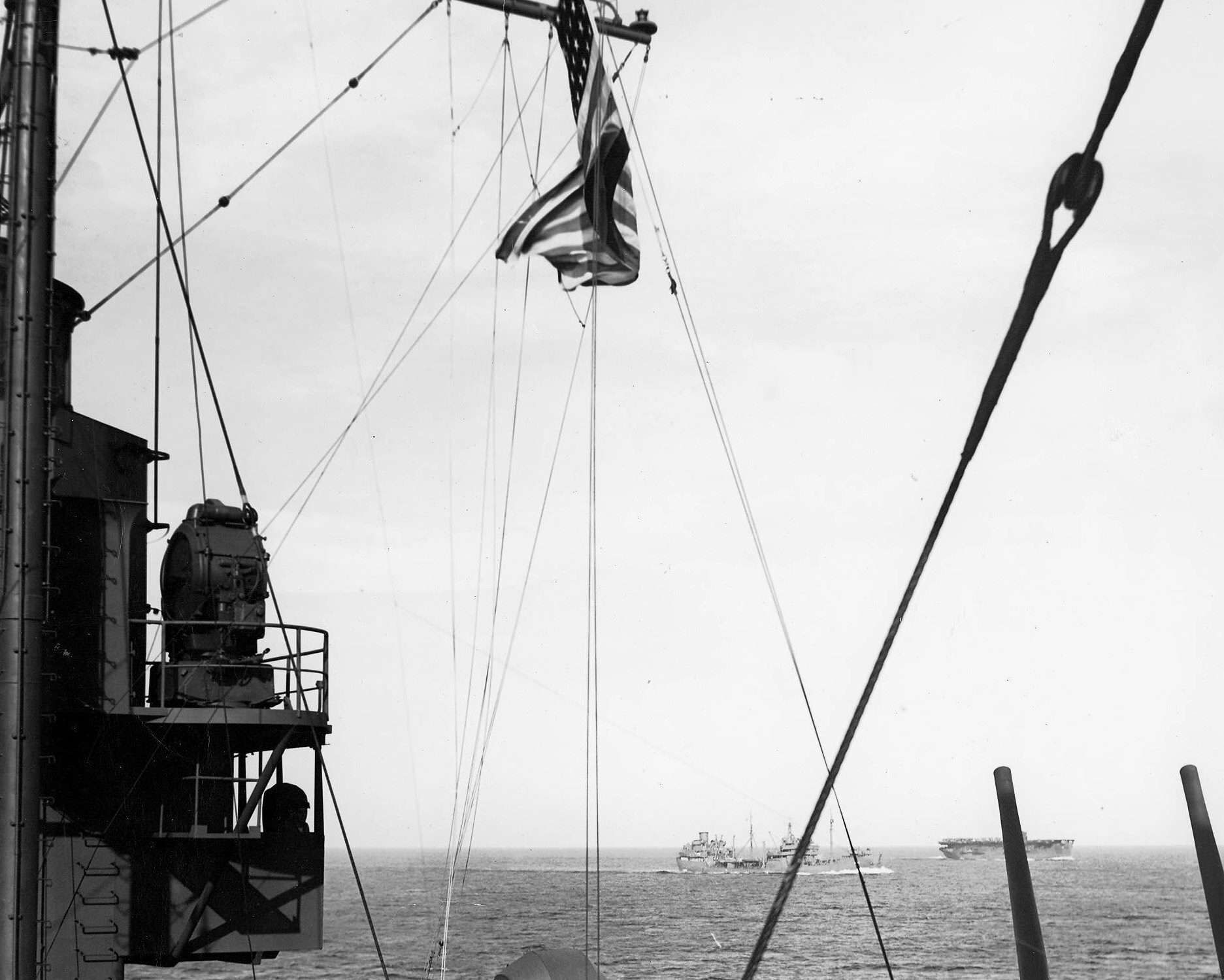 383k | The national ensign flies from an unidentified ship, part of a Pacific War Zone convoy circa 1942–1943. An unidentified tanker and the auxiliary aircraft carrier USS Nassau (ACV-16) are the ships in the distance. National Naval Aviation Museum photo, # 2000.091.054.022. |
