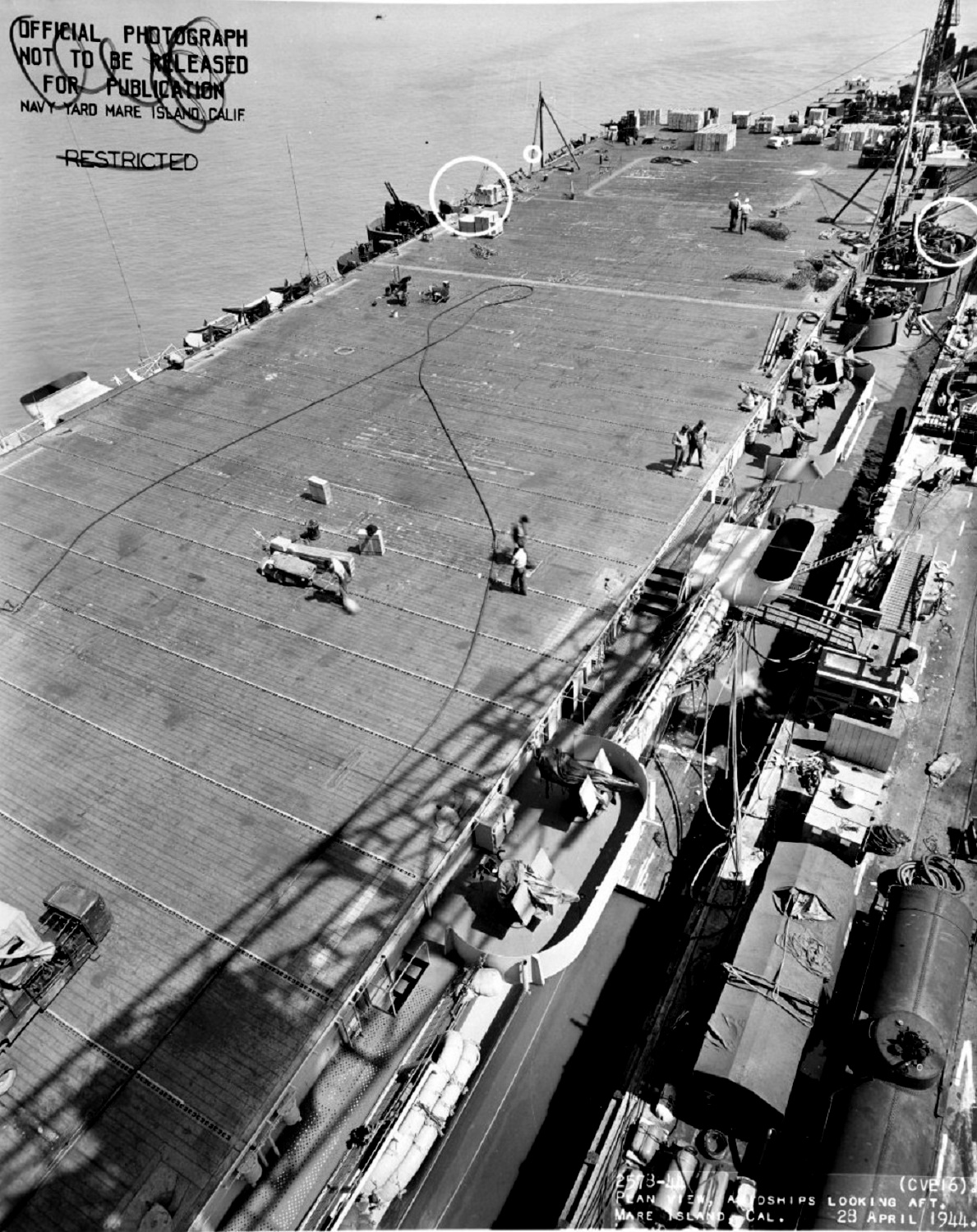 651k | USS Nassau (CVE-16), looking forward, Mare Island Navy Yard, 28 April 1944. Circles mark recent alterations. Note test load on catapult. National Archives and Records Administration (NARA), photo # 19-N-65111. |